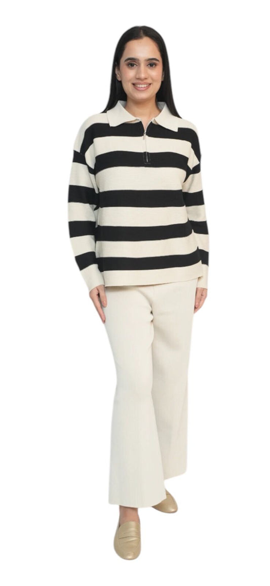 Our most formal and heavily ribbed thick striped co-ord set with drop shoulders, a Zip...