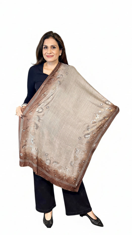 Wrap yourself in elegance with our Pashmina Ombre Stole, designed in a smooth beige-to-brown gradient...