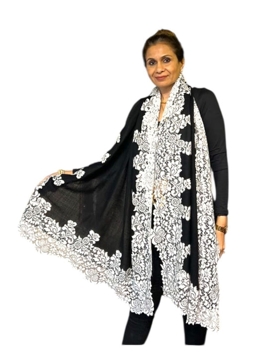 Pure Cashmere Knitted Stole with Allover Self Color Swarovski Floral Crystal Design. Care Instructions: Dry...