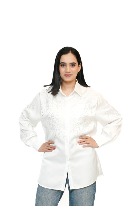 About Productย - The shirt features an embroidered design resembling stylized fireworks or starbursts made of...