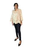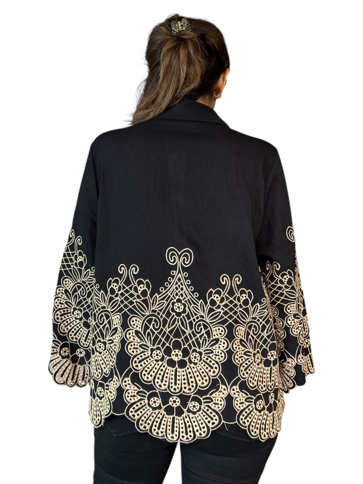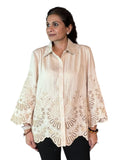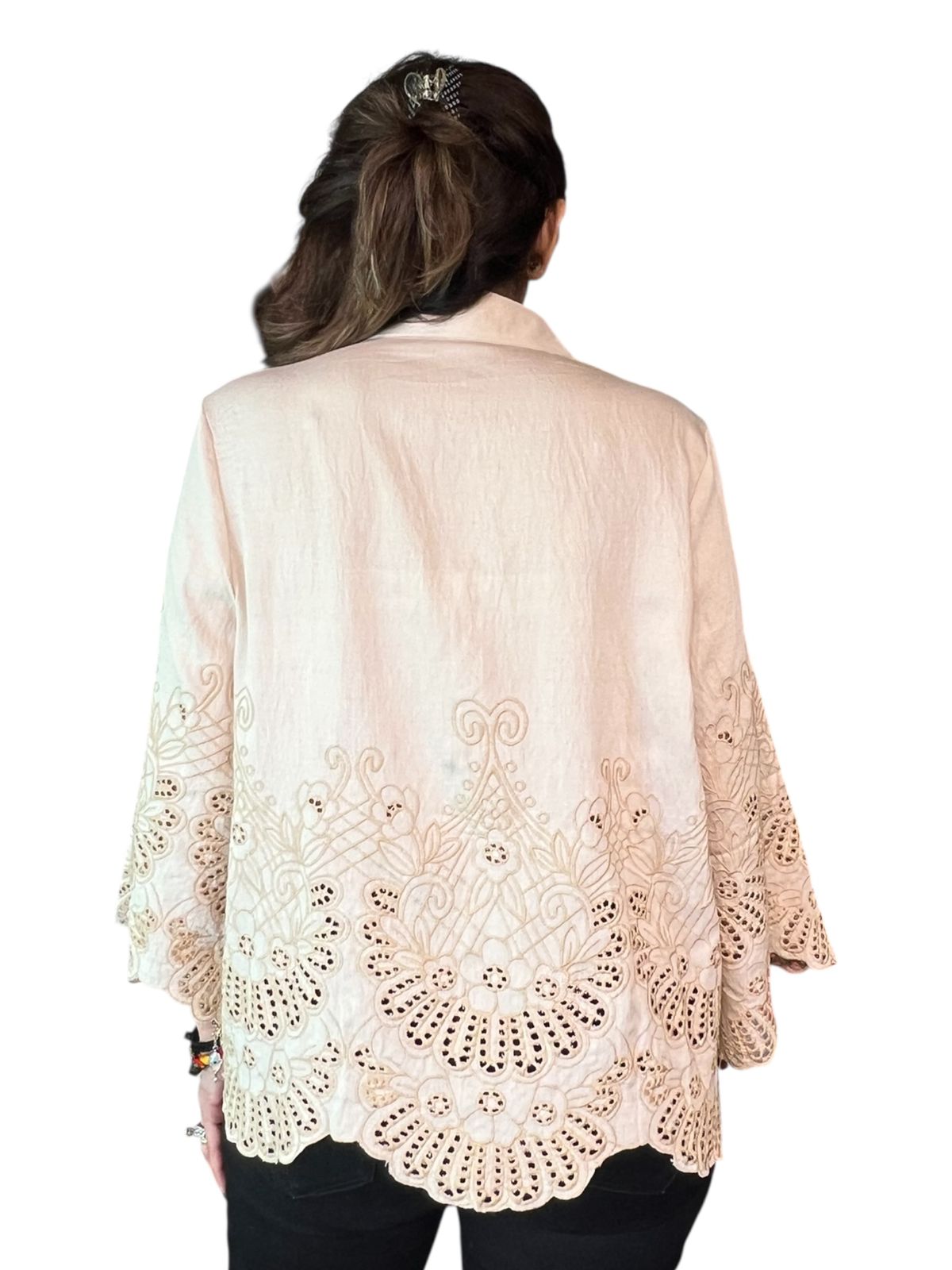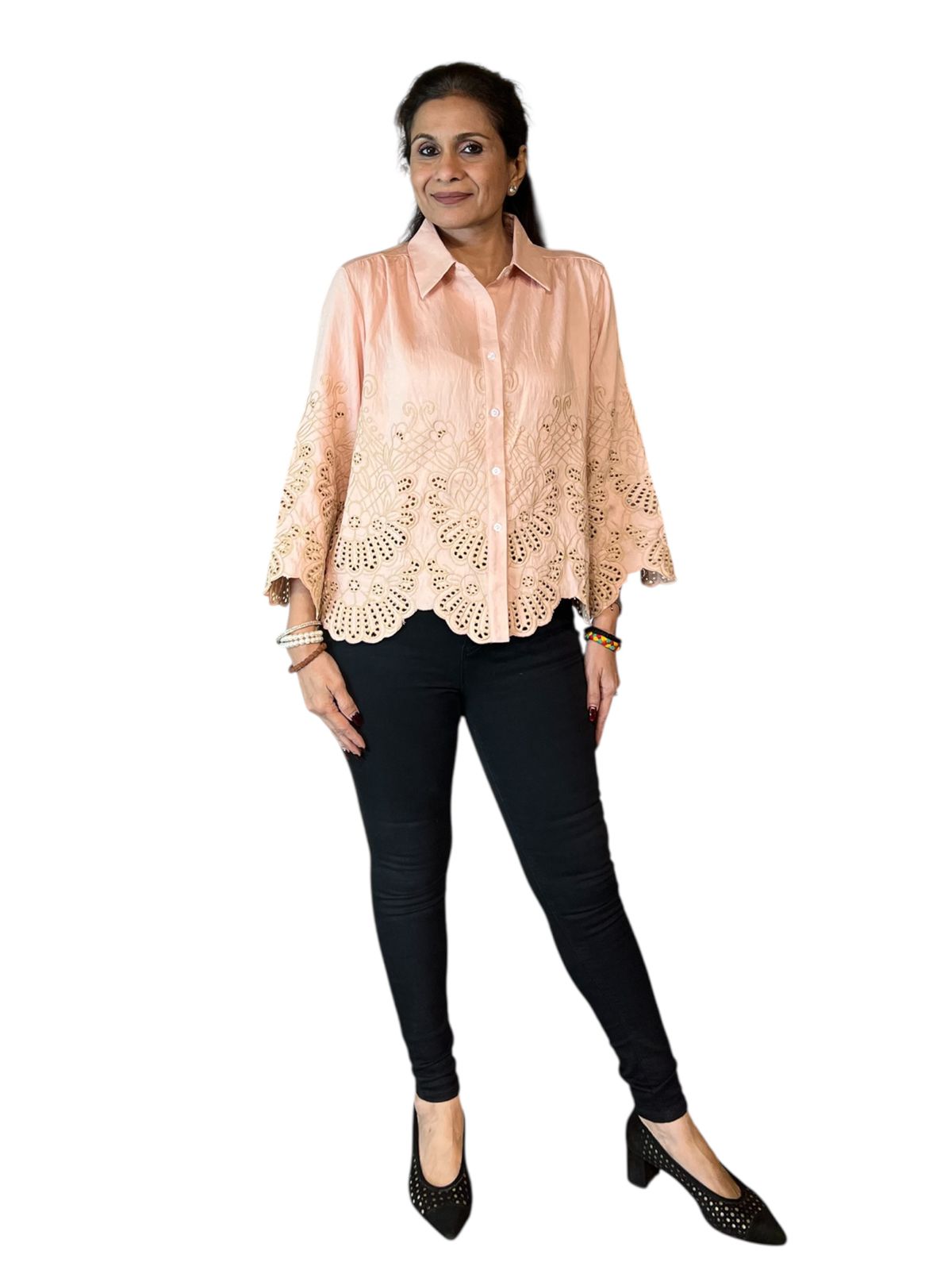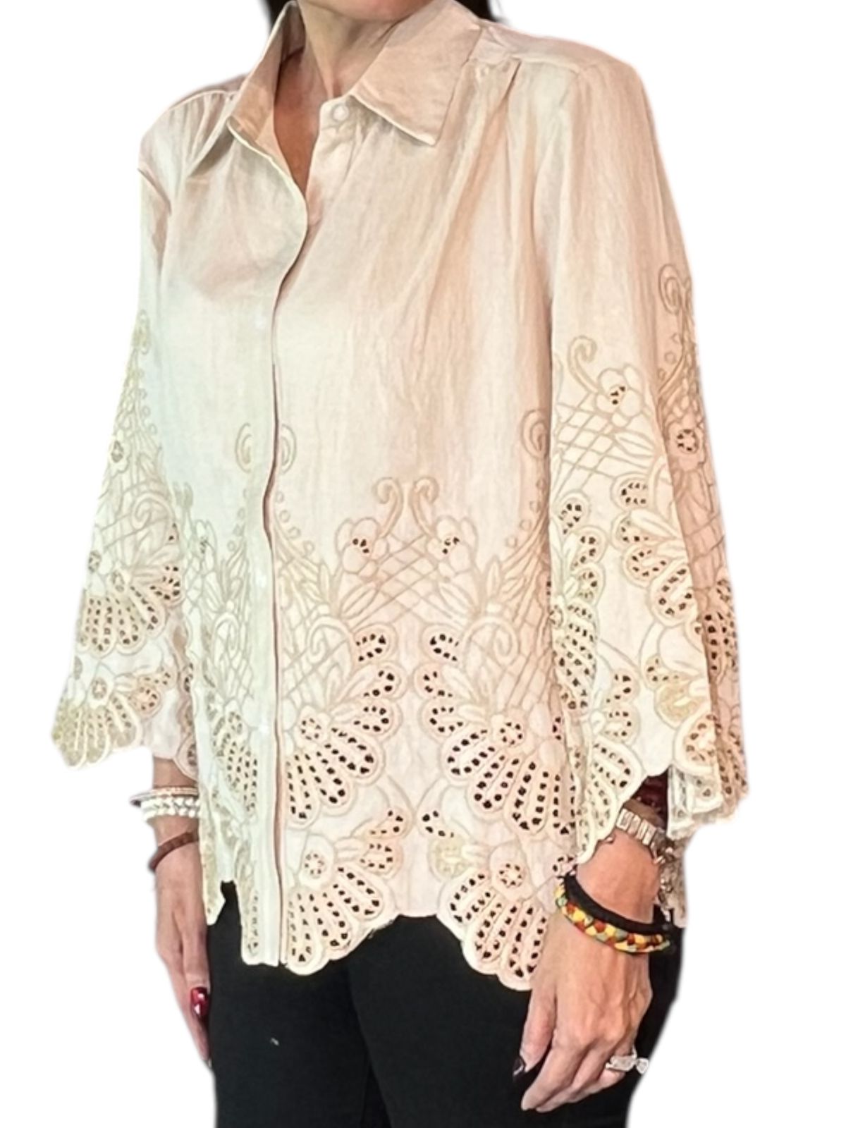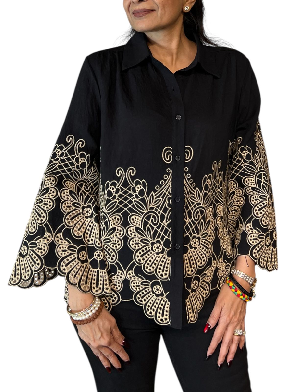 Elevate your everyday style with our Bloomer Shirt, a perfect fusion of comfort and sophistication. Crafted from soft, breathable fabric, this shirt features exquisite floral cutwork embroidery and scalloped edges that create a timeless, feminine silhouette. The relaxed fit and button-down front make it effortlessly chic, while the flared sleeves add a graceful touch.