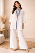 Fresh, calming, and effortlessly chic, the Bluebell Co-Ord Set brings a touch of soft color to classic whites. Made from a lightweight linen-blend fabric, this co-ord set features delicate blue floral embroidery that adds freshness and refined detail to the design.