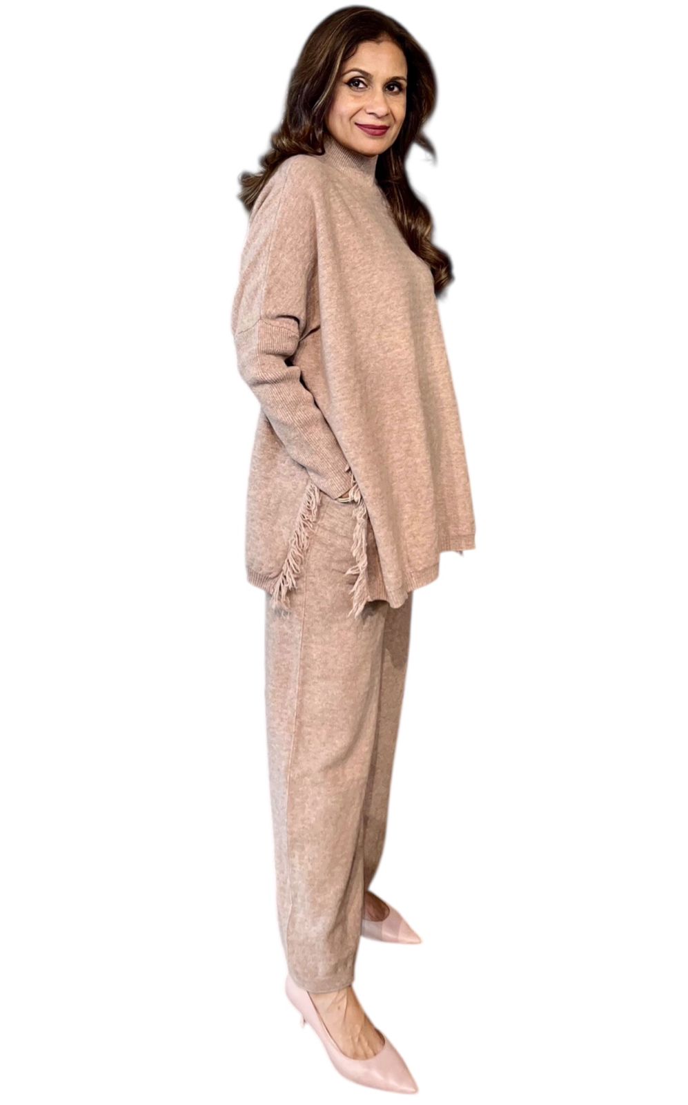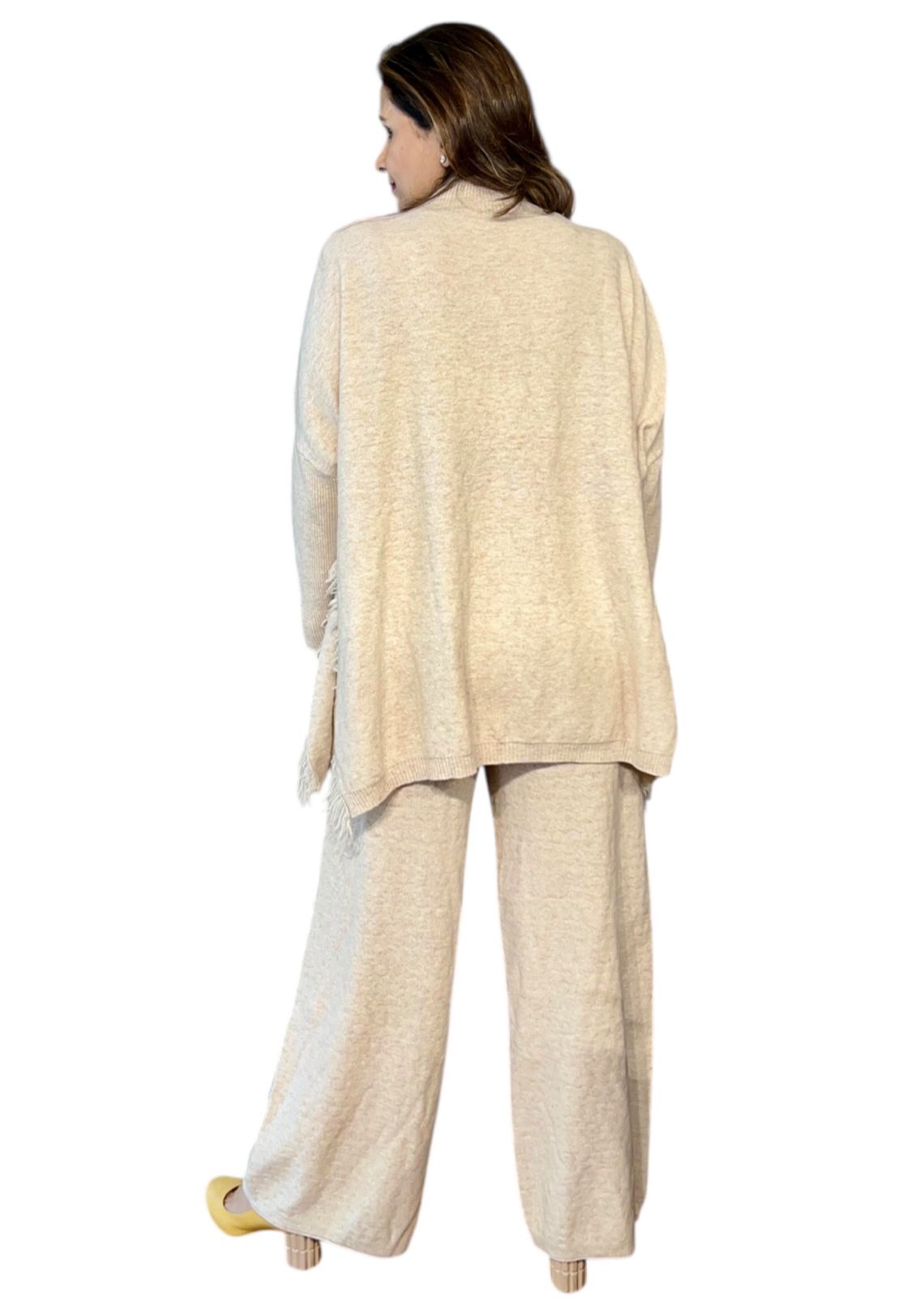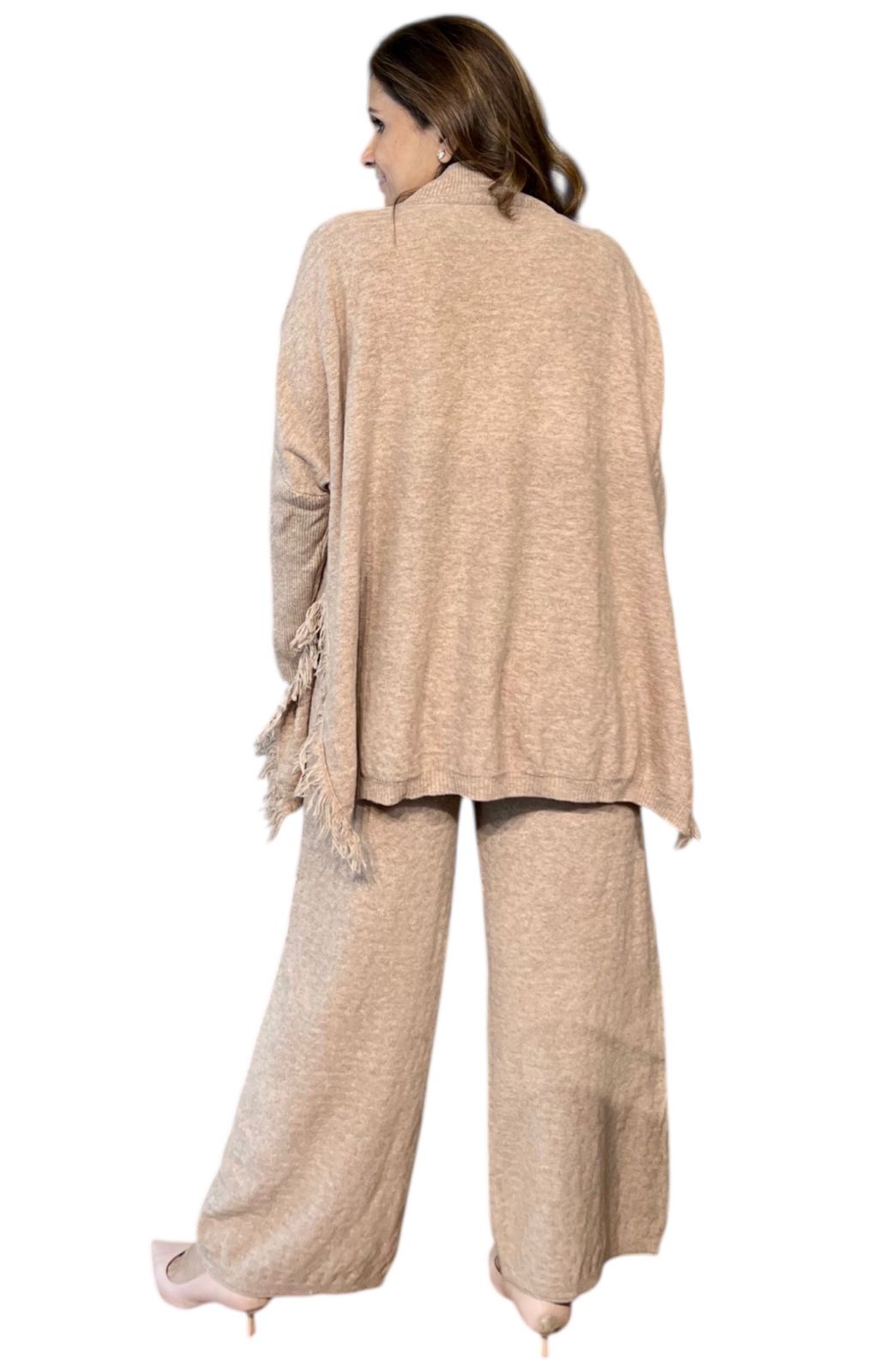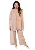 A luxuriously soft knitted co-ord set designed for ultimate comfort with a refined, elegant look. Crafted from cozy, cashmere-feel knit fabric, this set features a relaxed longline top paired with wide-leg pants for an effortlessly chic silhouette.