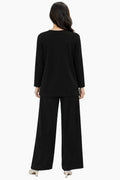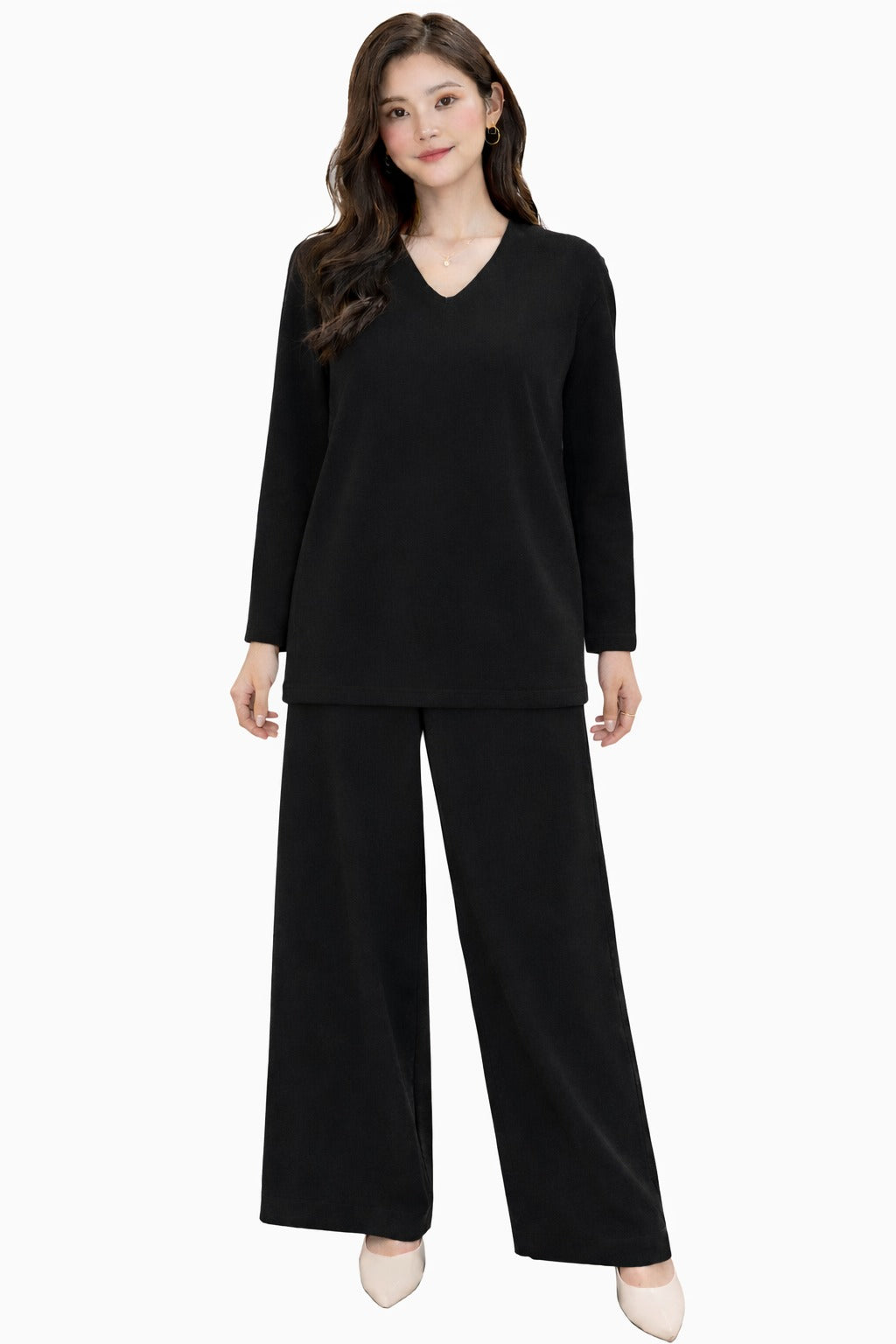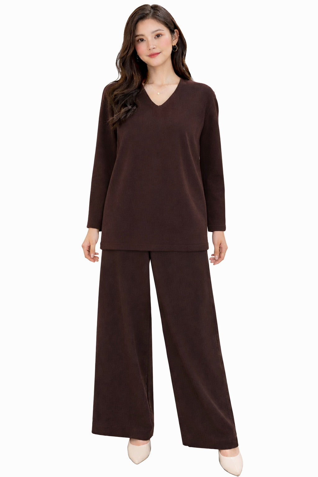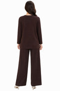Designed for relaxed elegance, this co-ord set blends comfort with timeless style. The set features a softly structured V-neck top with full sleeves, paired with flowy wide-leg pants that create a flattering, elongated silhouette. Crafted from a smooth, breathable fabric, it offers all-day ease while maintaining a polished look.