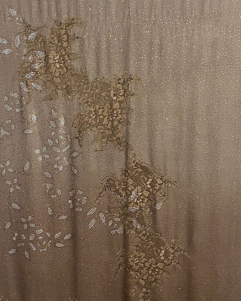 Design: Intricate floral lace with dotted shimmer accents