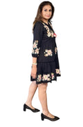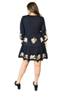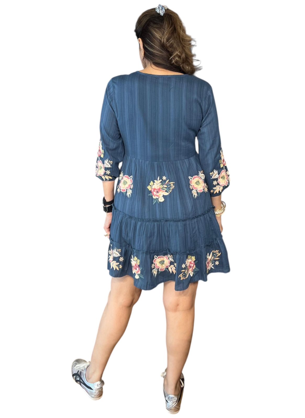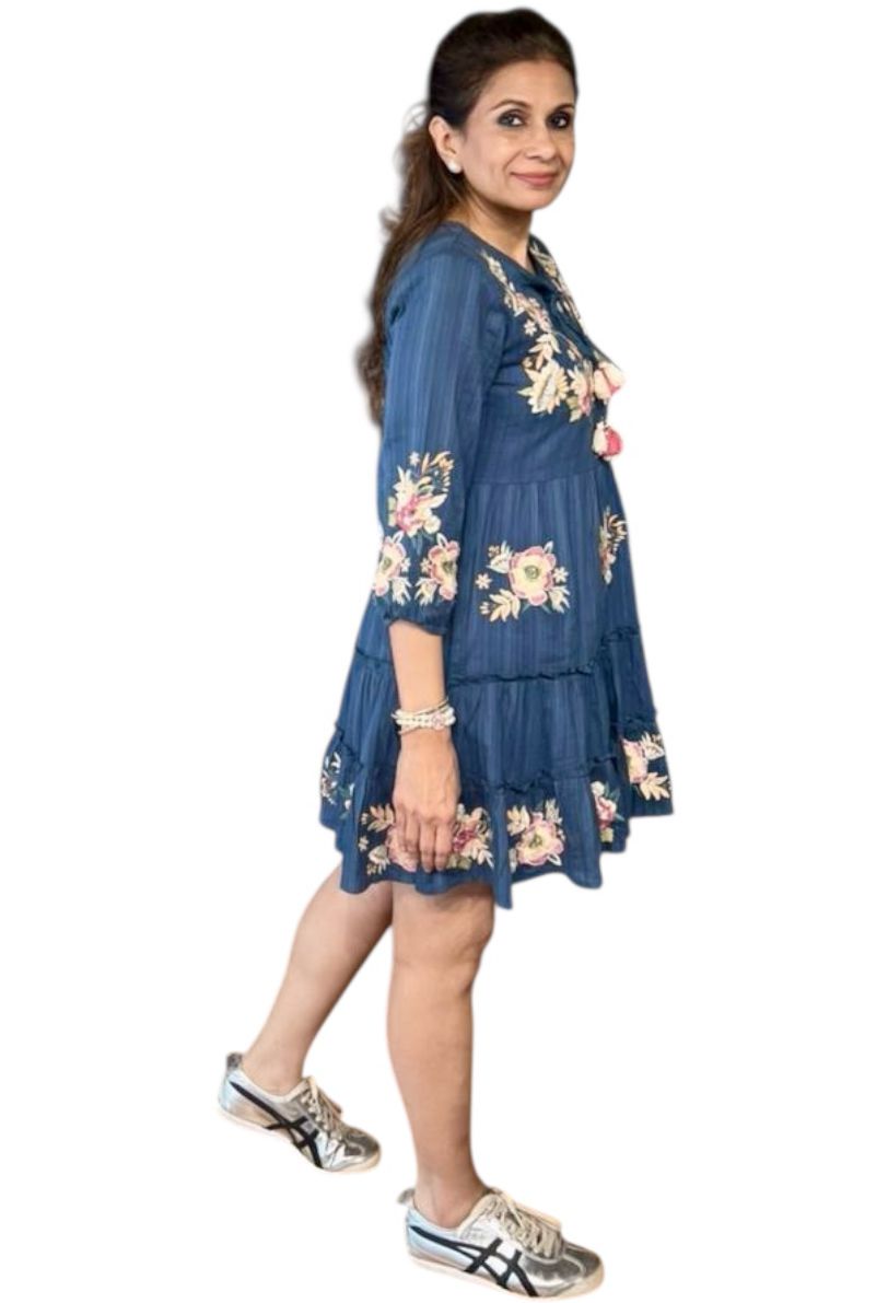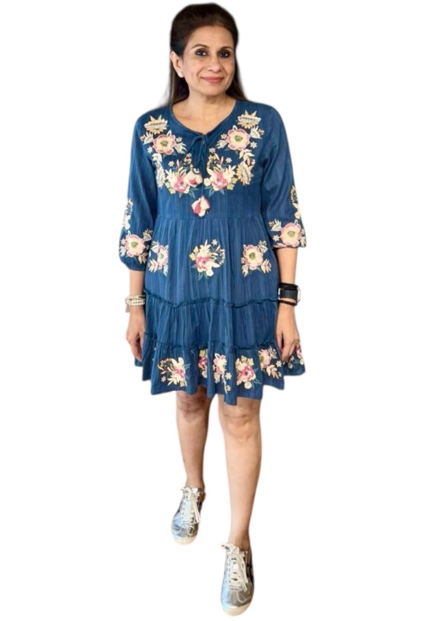 Adorned with delicate floral embroidery across the neckline, sleeves, and hem, this dress exudes soft romantic charm. The flowy tiered silhouette adds beautiful movement, while the gently gathered waist offers a flattering yet relaxed fit.