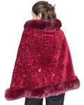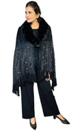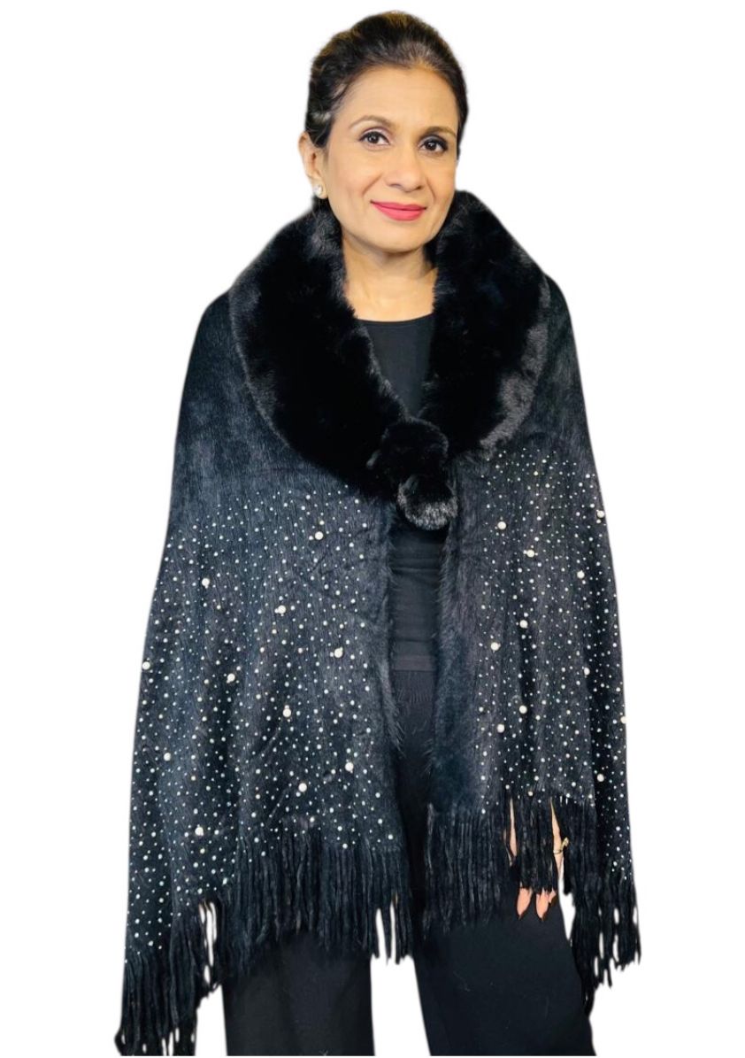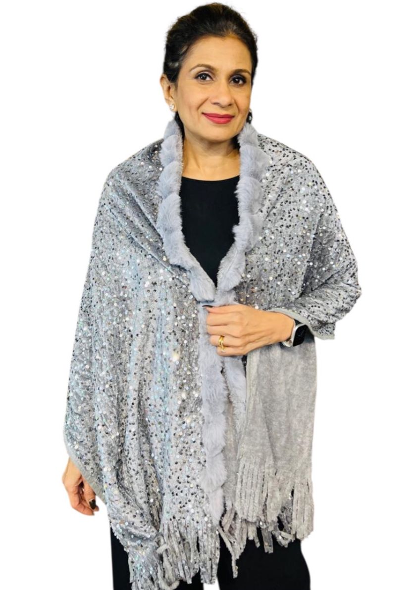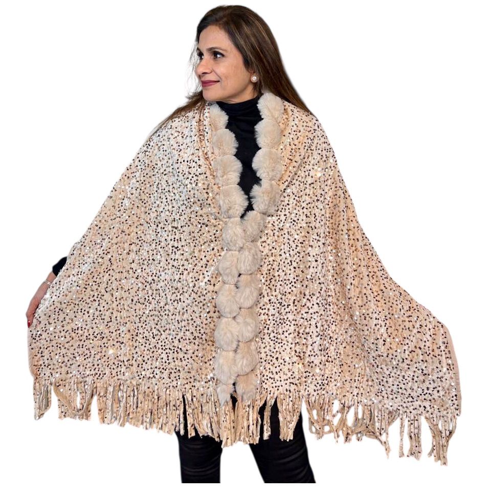 Can be worn both as a stole or as a cape, with shimmering sequins & soft fur trim.