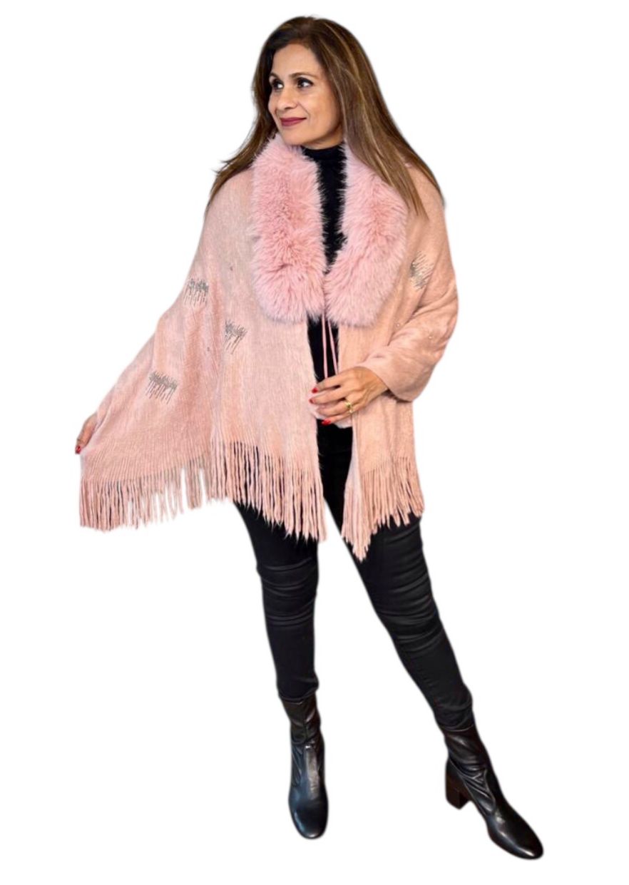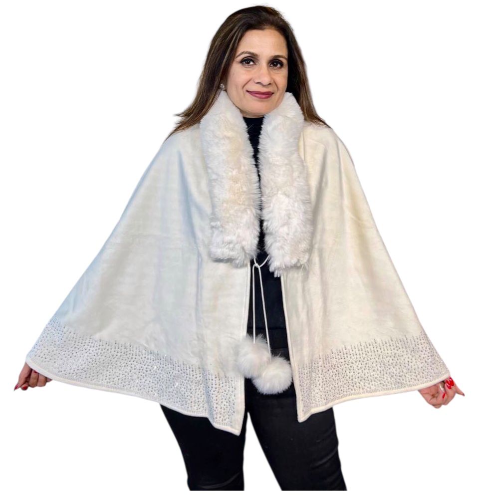 Soft statement cape with a plush fur collar and delicate crystal detailing.