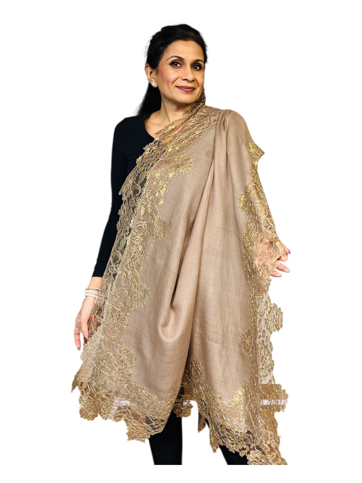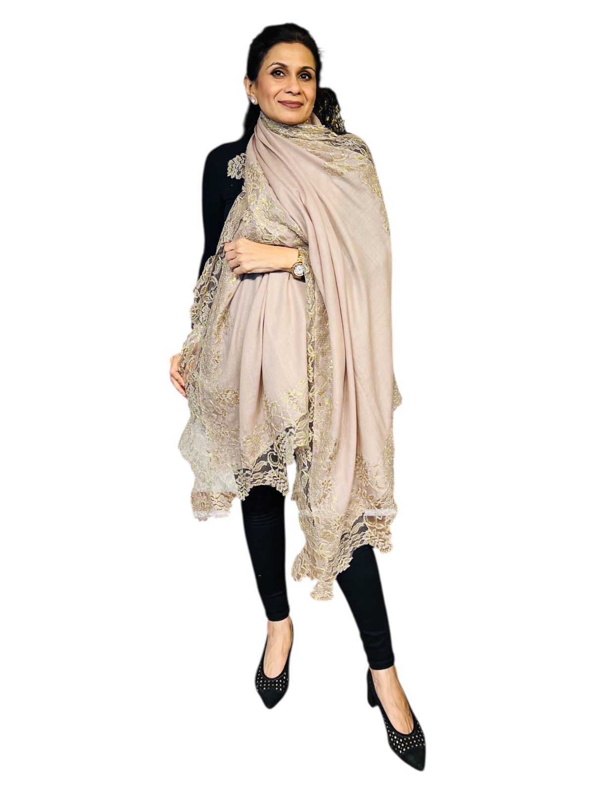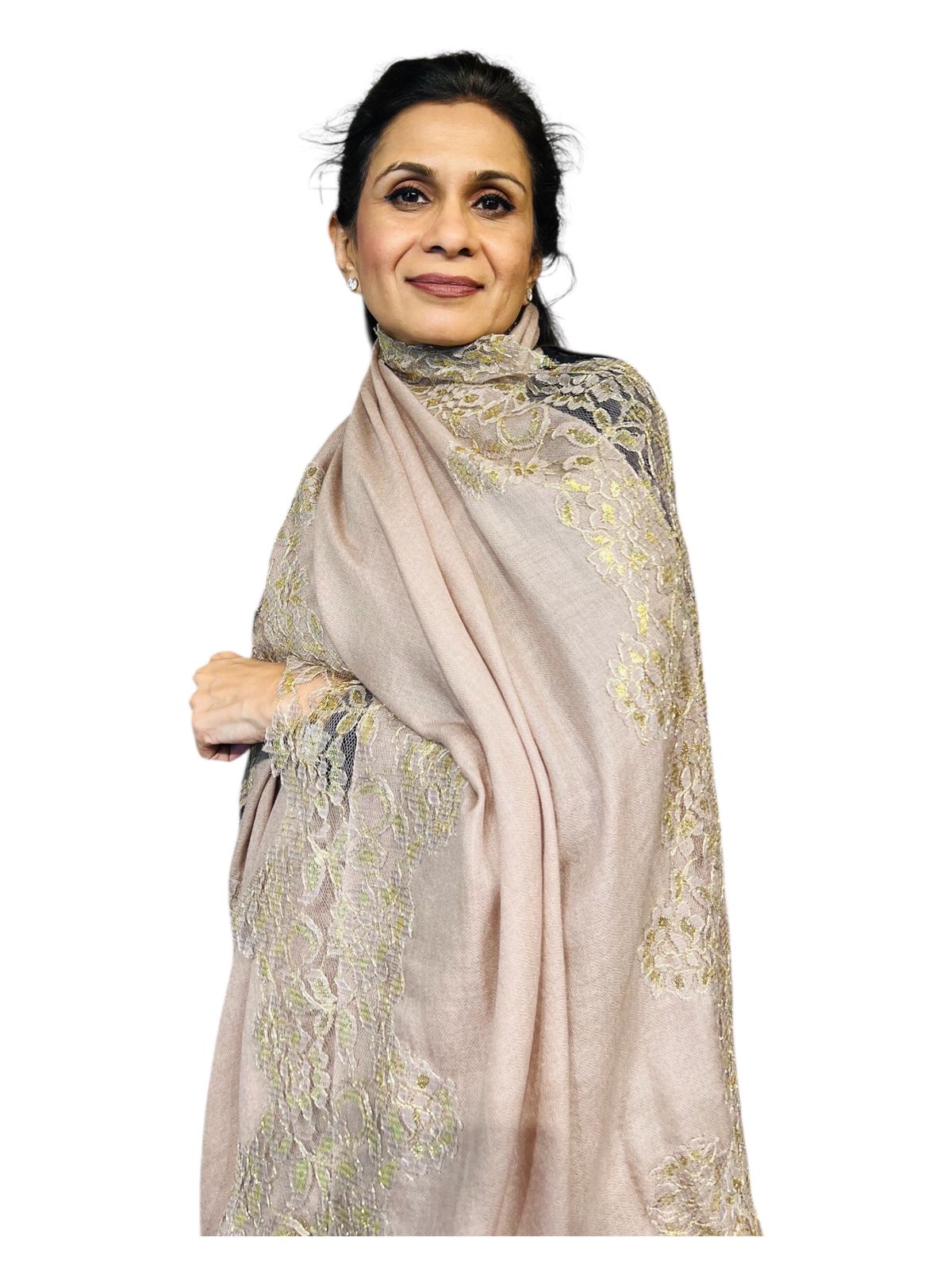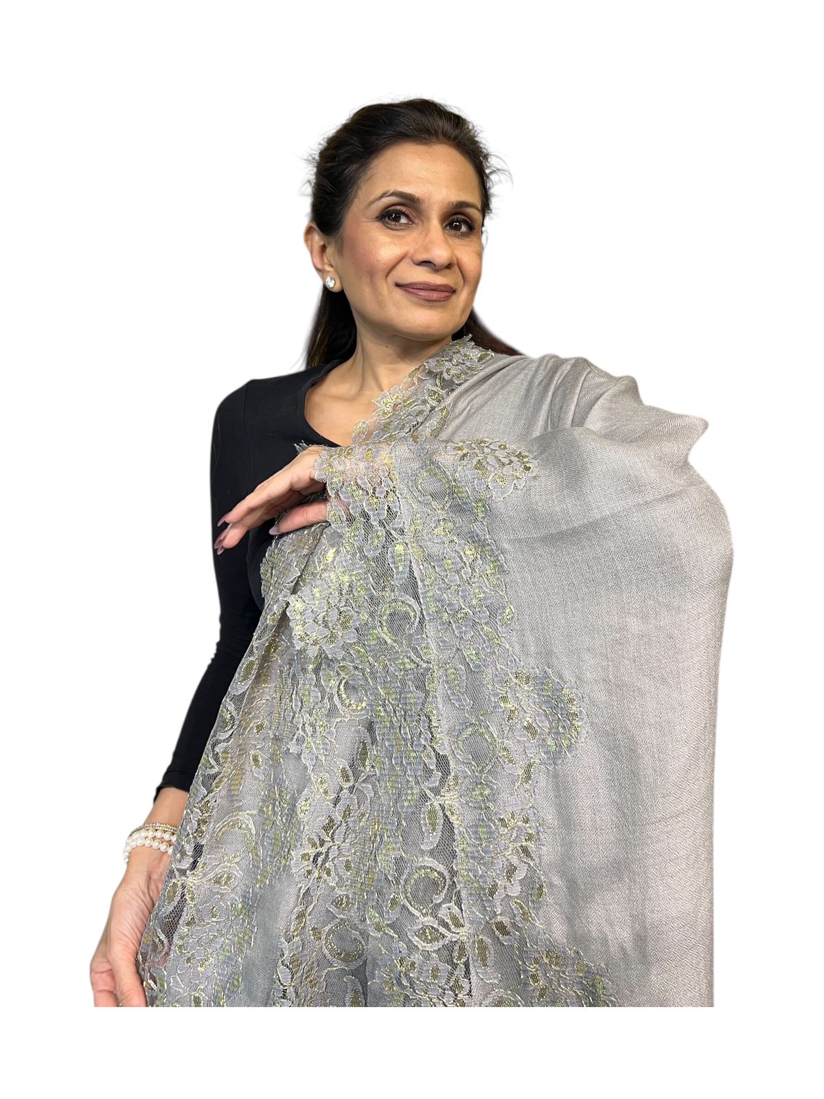Introducing our luxurious Pashmina stole adorned with delicate French lace – where timeless tradition meets Parisian elegance.