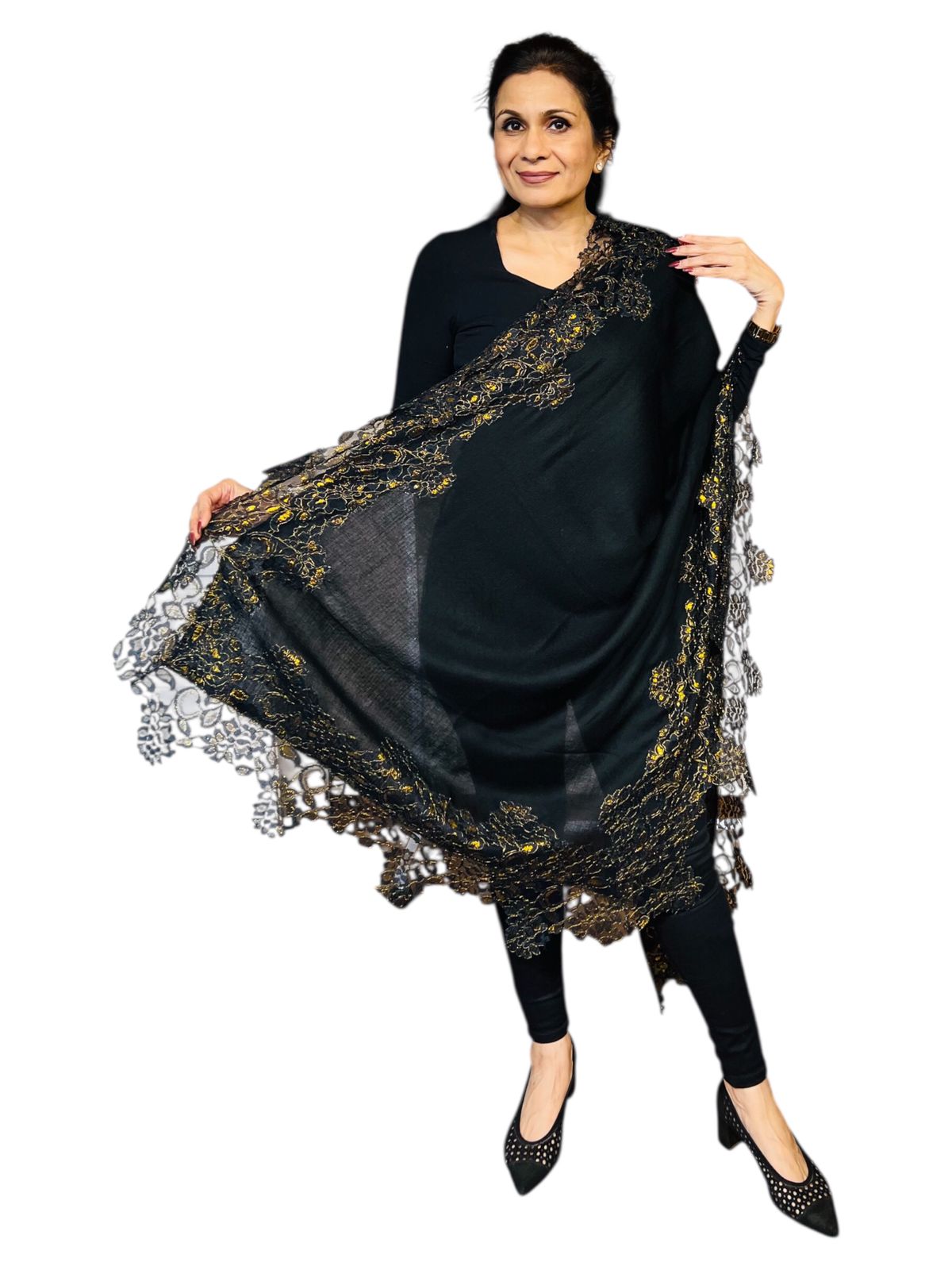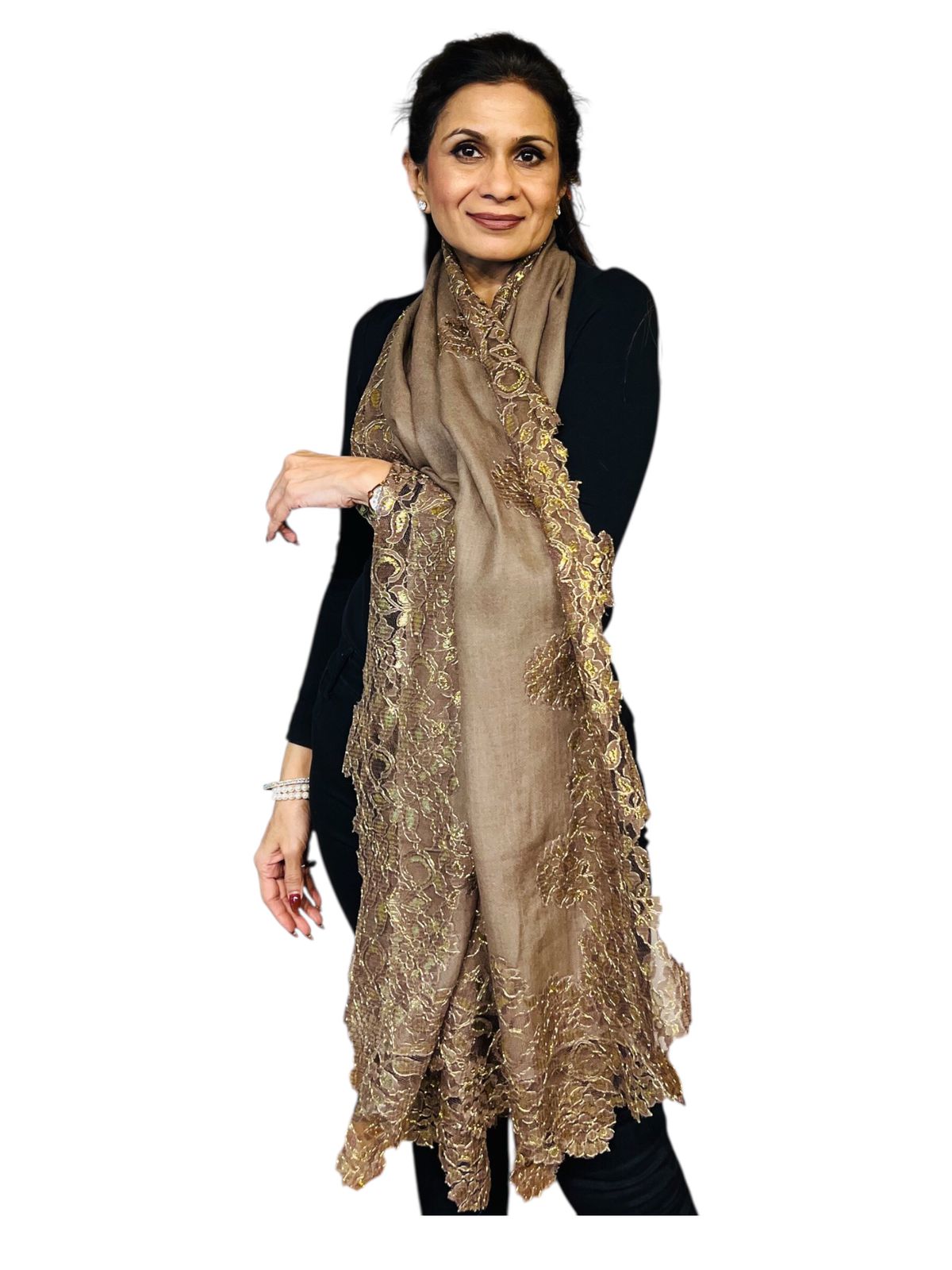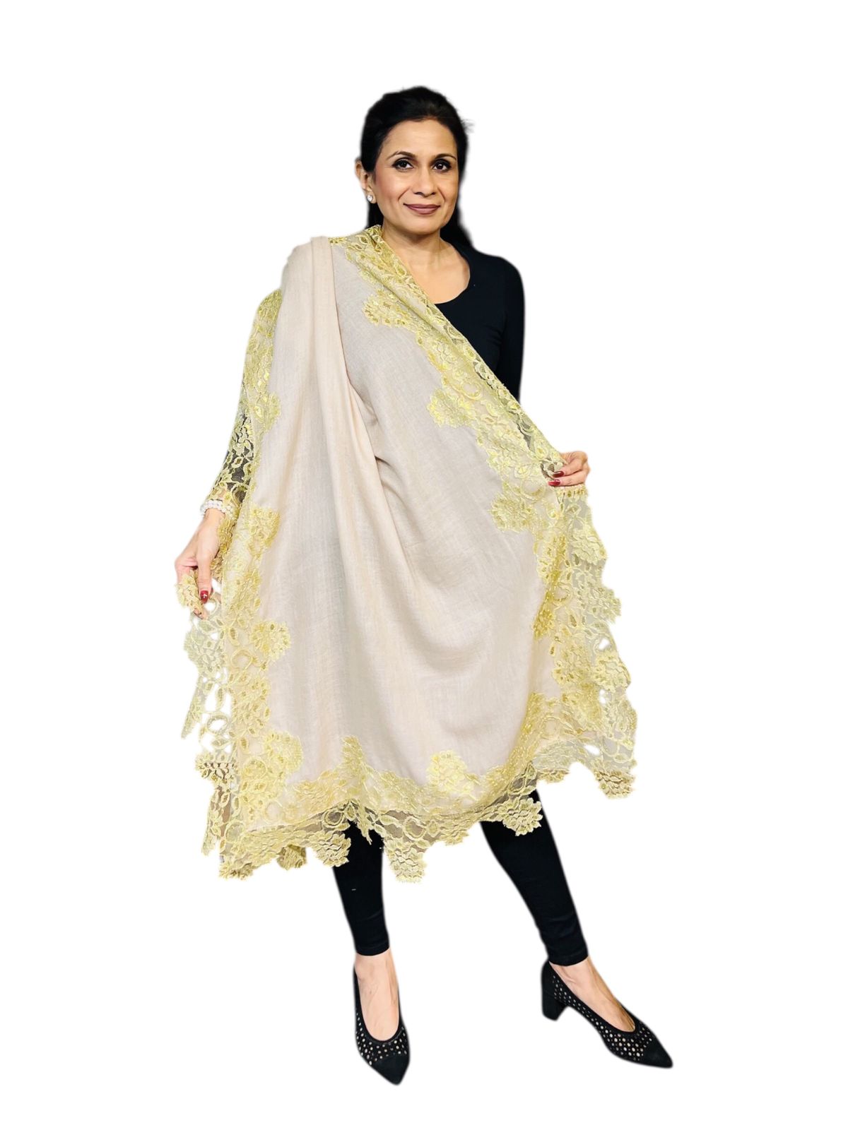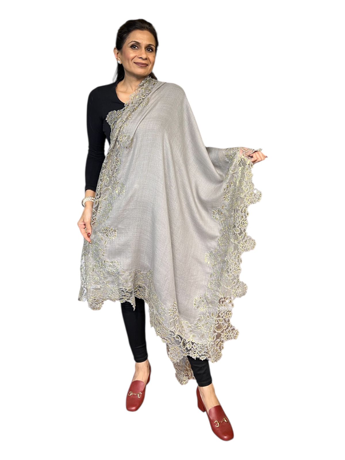 Introducing our luxurious Pashmina stole adorned with delicate French lace – where timeless tradition meets Parisian elegance.