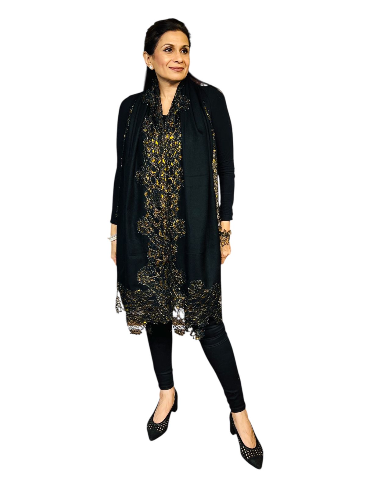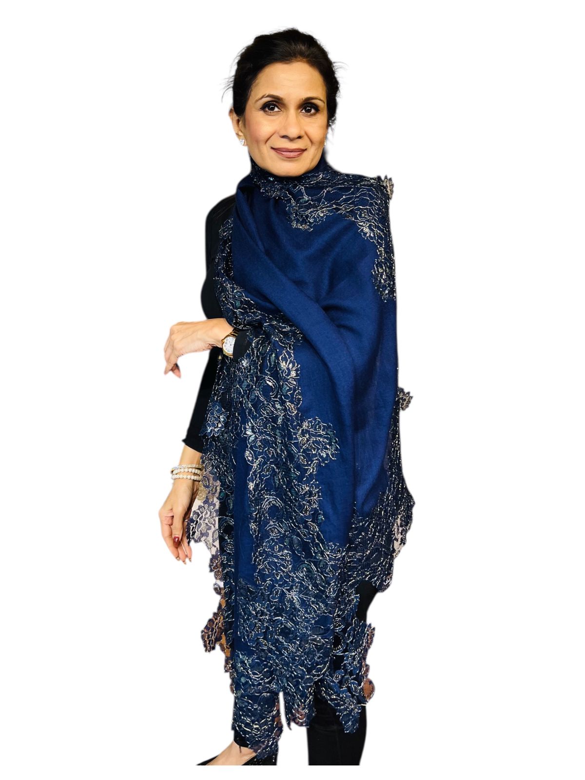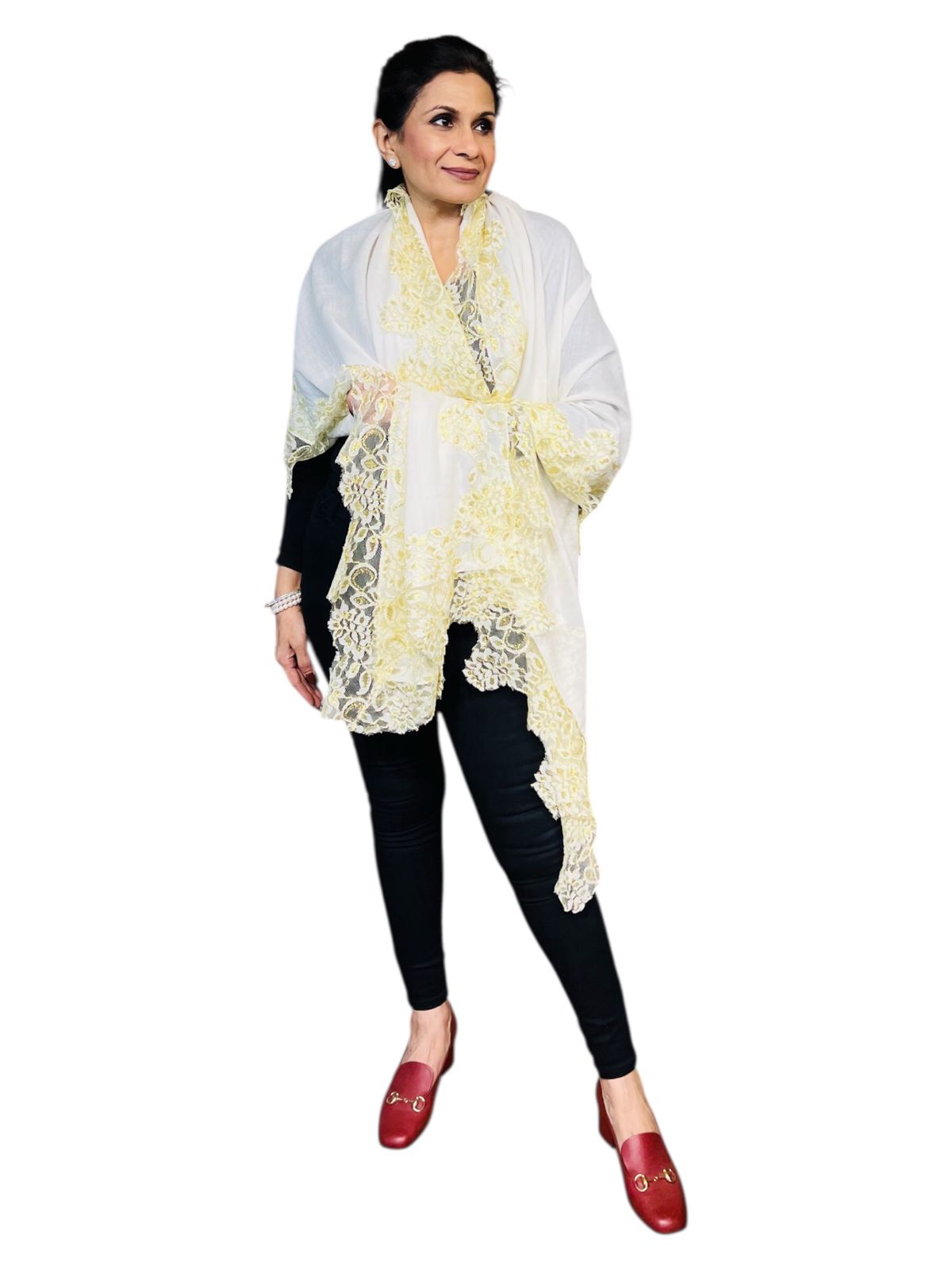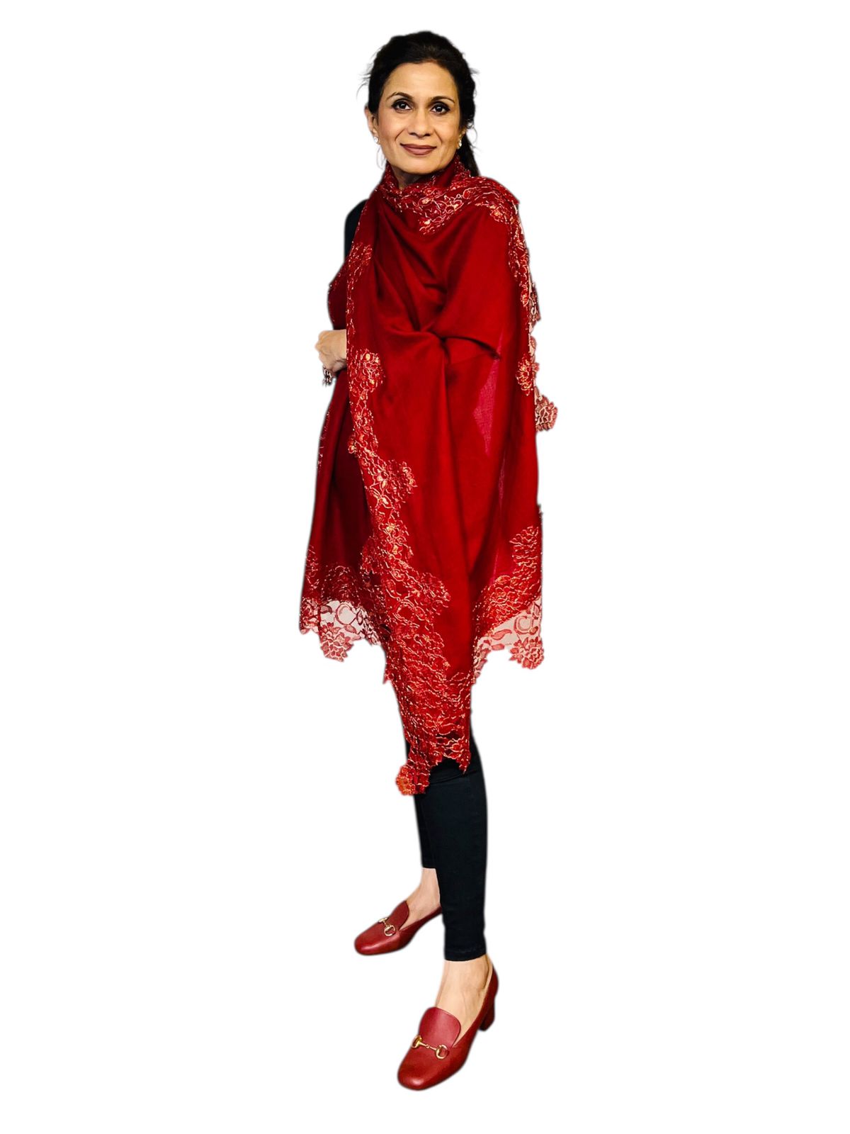Introducing our luxurious Pashmina stole adorned with delicate French lace – where timeless tradition meets Parisian elegance.