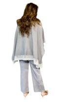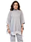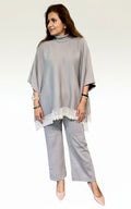 Step into effortless elegance with our Grey Grace Co-Ord Set. The top features a soft, flowy kaftan-style silhouette with a cozy high neck and a delicate lace hem, blending comfort with refined charm. Paired with wide-leg knit pants, this set offers a relaxed yet stylish look — perfect for travel, brunches, or cozy evenings.