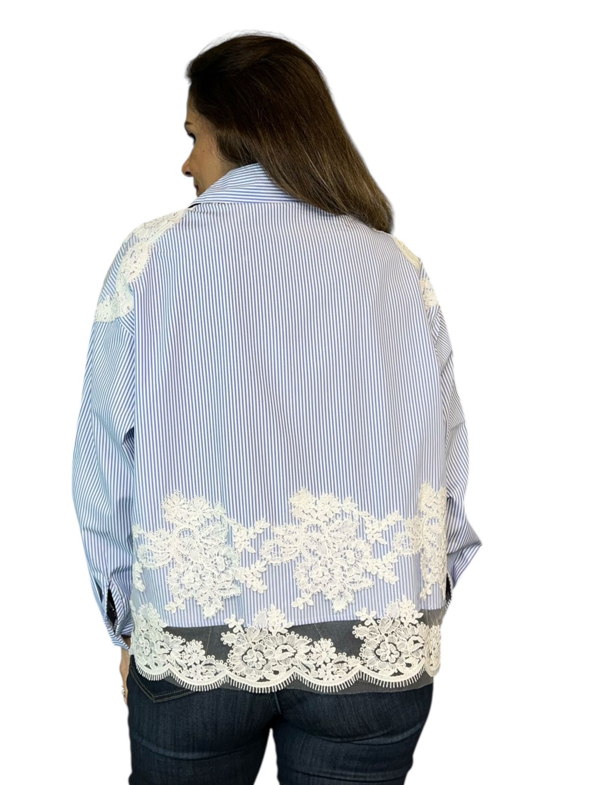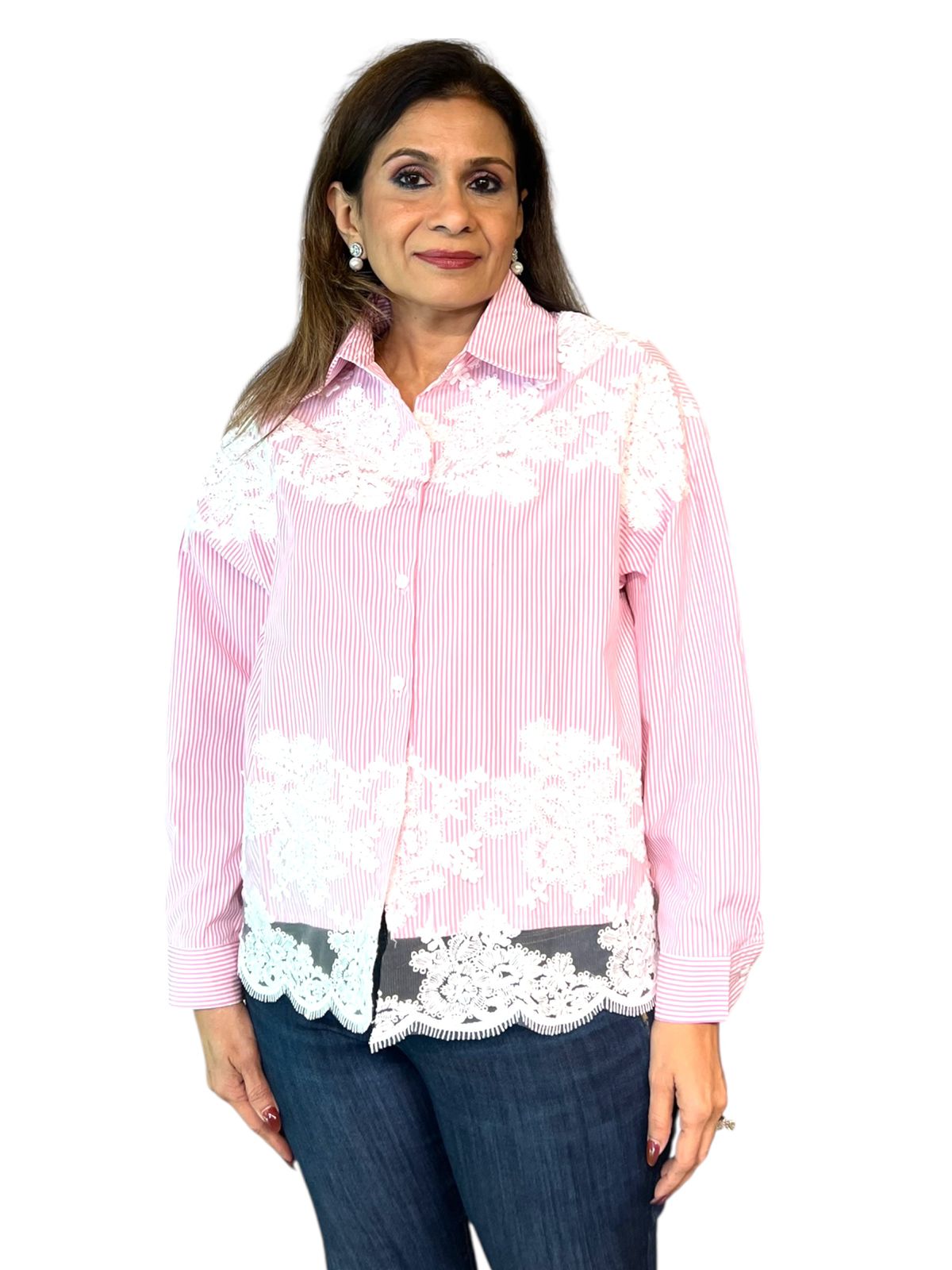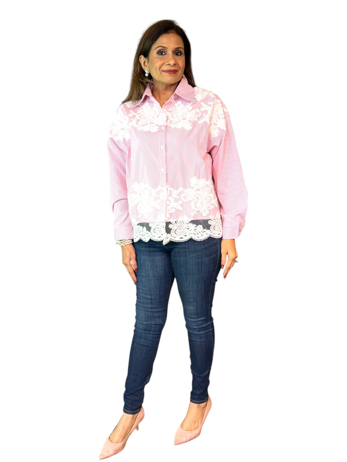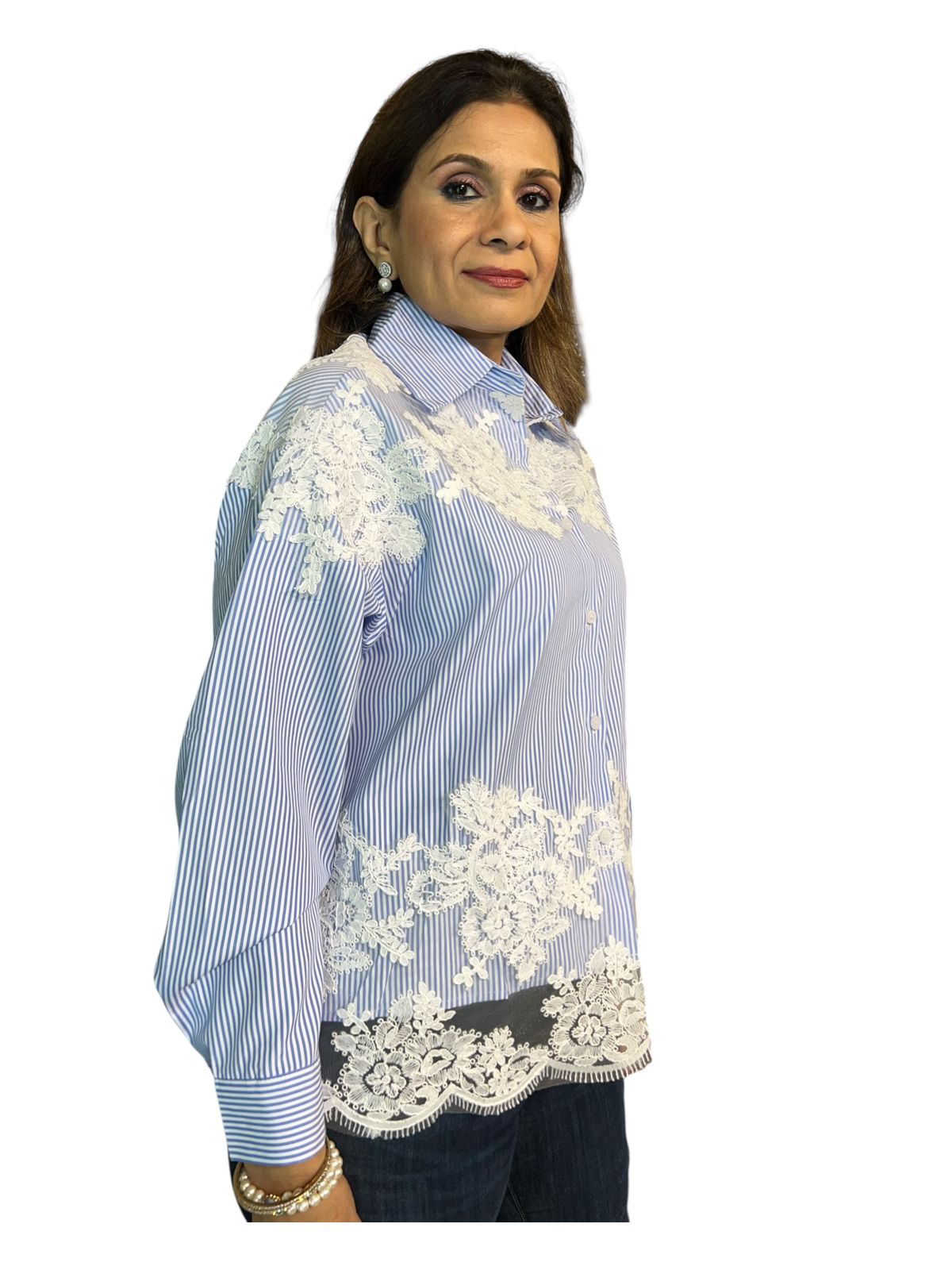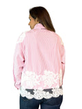 Classic stripes meet feminine elegance in the Lace Charm Shirt . Tailored with a relaxed drop-shoulder fit and adorned with delicate lace detailing across the front and hem, these shirts bring effortless sophistication to your everyday wardrobe. Available in Blue, Pink Stripe, and Blue Stripe, they pair beautifully with denims, trousers, or skirts for a versatile day-to-evening look.