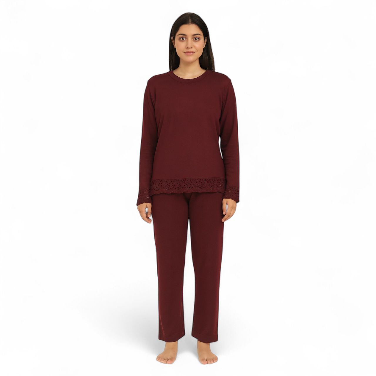 The Liora Lace Full Sleeves Co-ord Set blends elegance with everyday comfort. Featuring a relaxed-fit top with intricate lace detailing on the cuffs and hem, paired with wide-leg pants, this set is perfect for casual outings, travel, or brunch with friends.