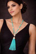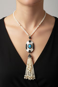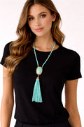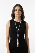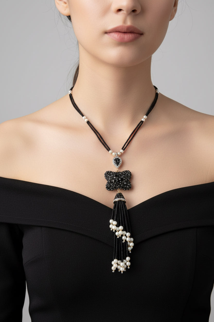 Mono Charm Tassel Necklace has a sleek, modern, and stylish vibe—perfect for Add a touch of modern elegance with the Mono Charm Tassel Necklace. Featuring a striking pendant with intricate beadwork and a flowing tassel, this handcrafted piece blends contemporary style with timeless sophistication.