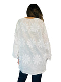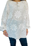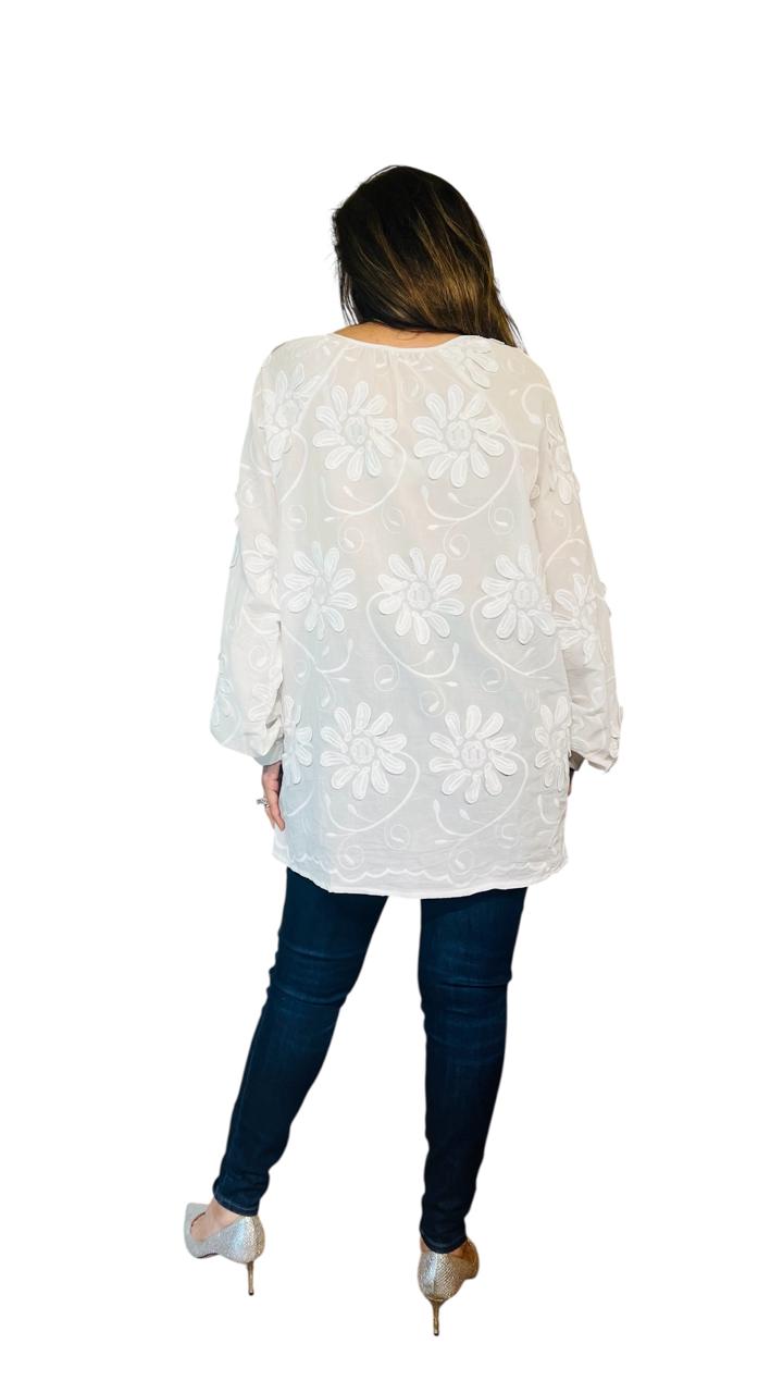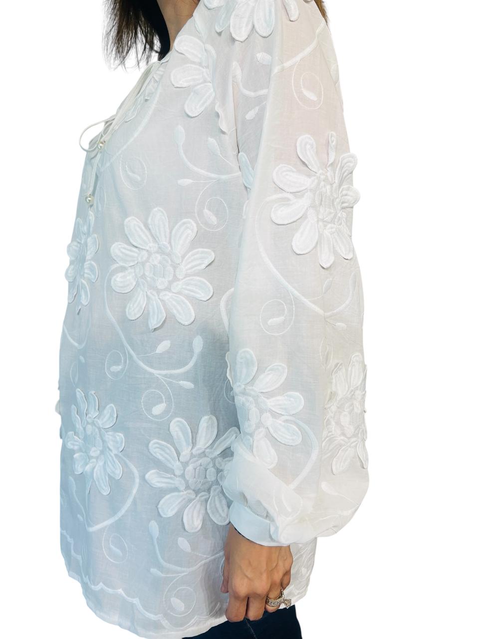 Crafted from a breezy, semi-sheer fabric, this graceful white top features intricate 3D floral embroidery that evokes the beauty of delicate petals kissed by pearls. The neckline is adorned with a dainty tie-up and pearl button accents, while full sleeves with gathered cuffs add a soft, romantic flair. Light, flowy, and versatile—this tunic is perfect for brunches, casual outings, or elegant evenings.