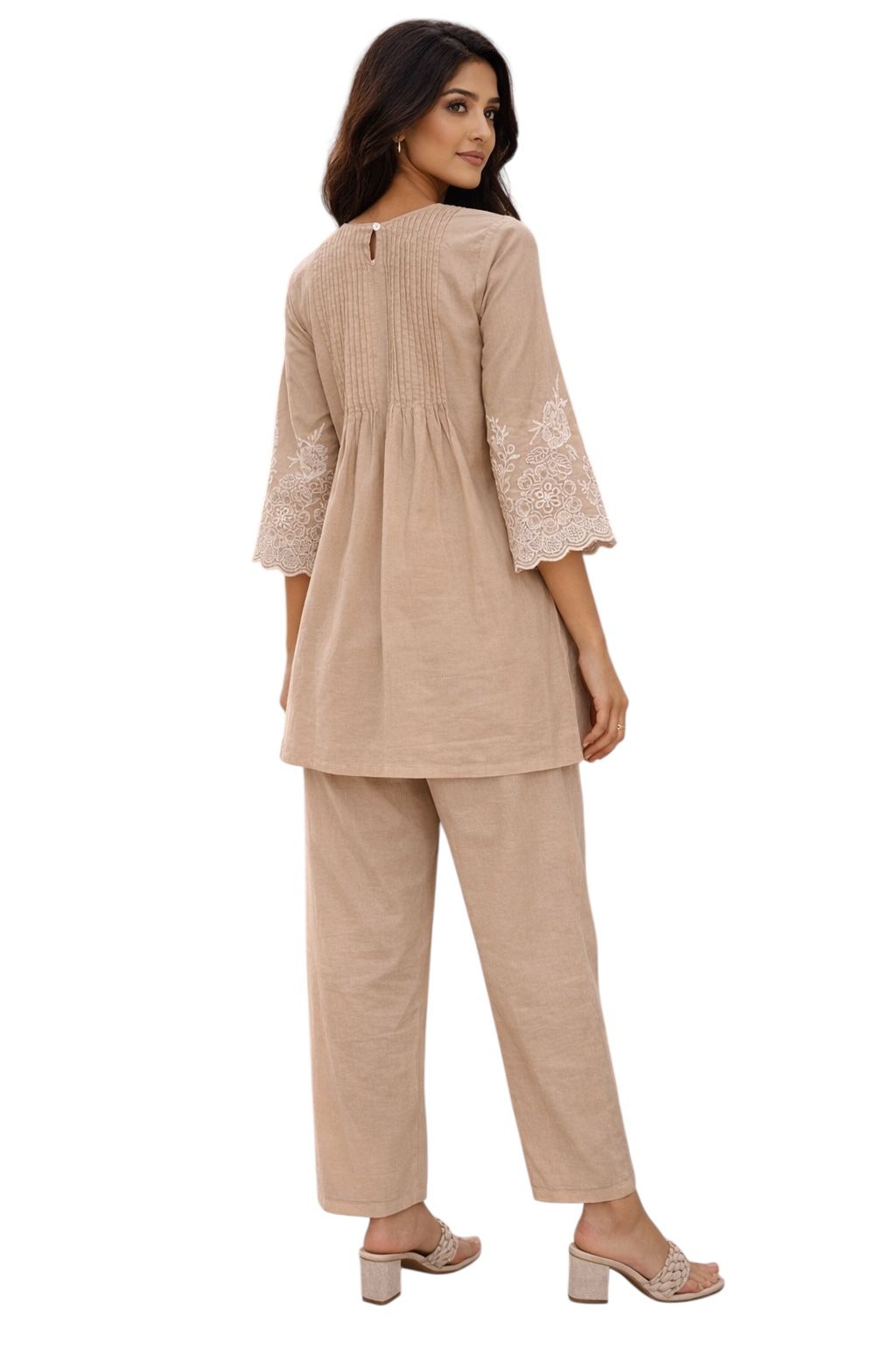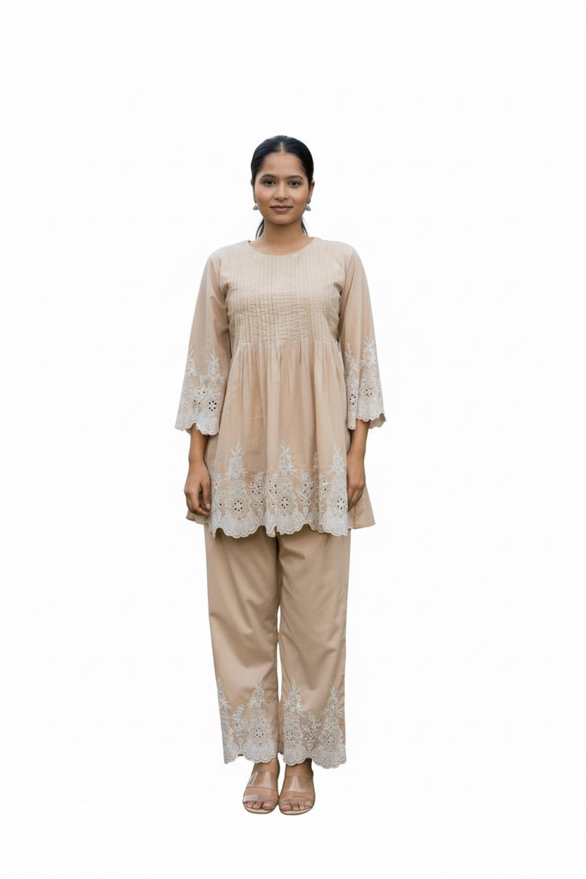 The kurta features delicate pintuck work on the yoke with intricate floral embroidery along the hem and sleeves. Scalloped embroidered borders add feminine charm, while the relaxed silhouette ensures effortless wearability. Paired with matching straight pants finished with coordinated embroidery, it creates a perfectly balanced look.