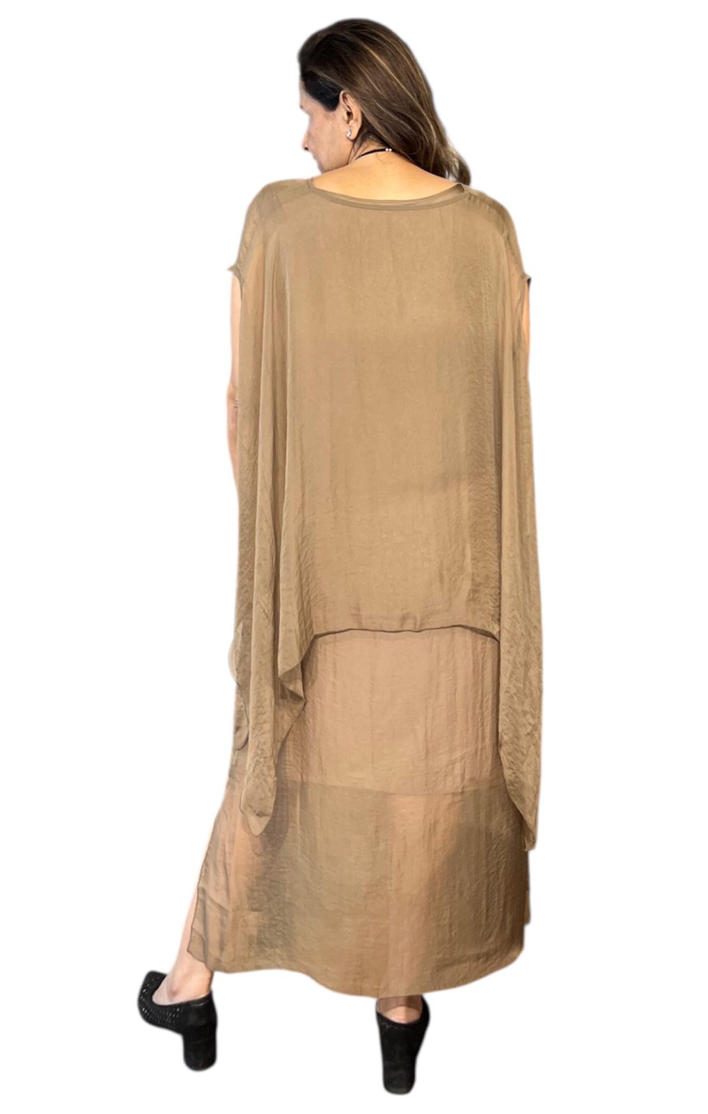 An effortlessly elegant layered dress designed for comfort and refined everyday style. Featuring a soft inner dress with a relaxed, flowy silhouette, this piece drapes beautifully and flatters the body with ease.