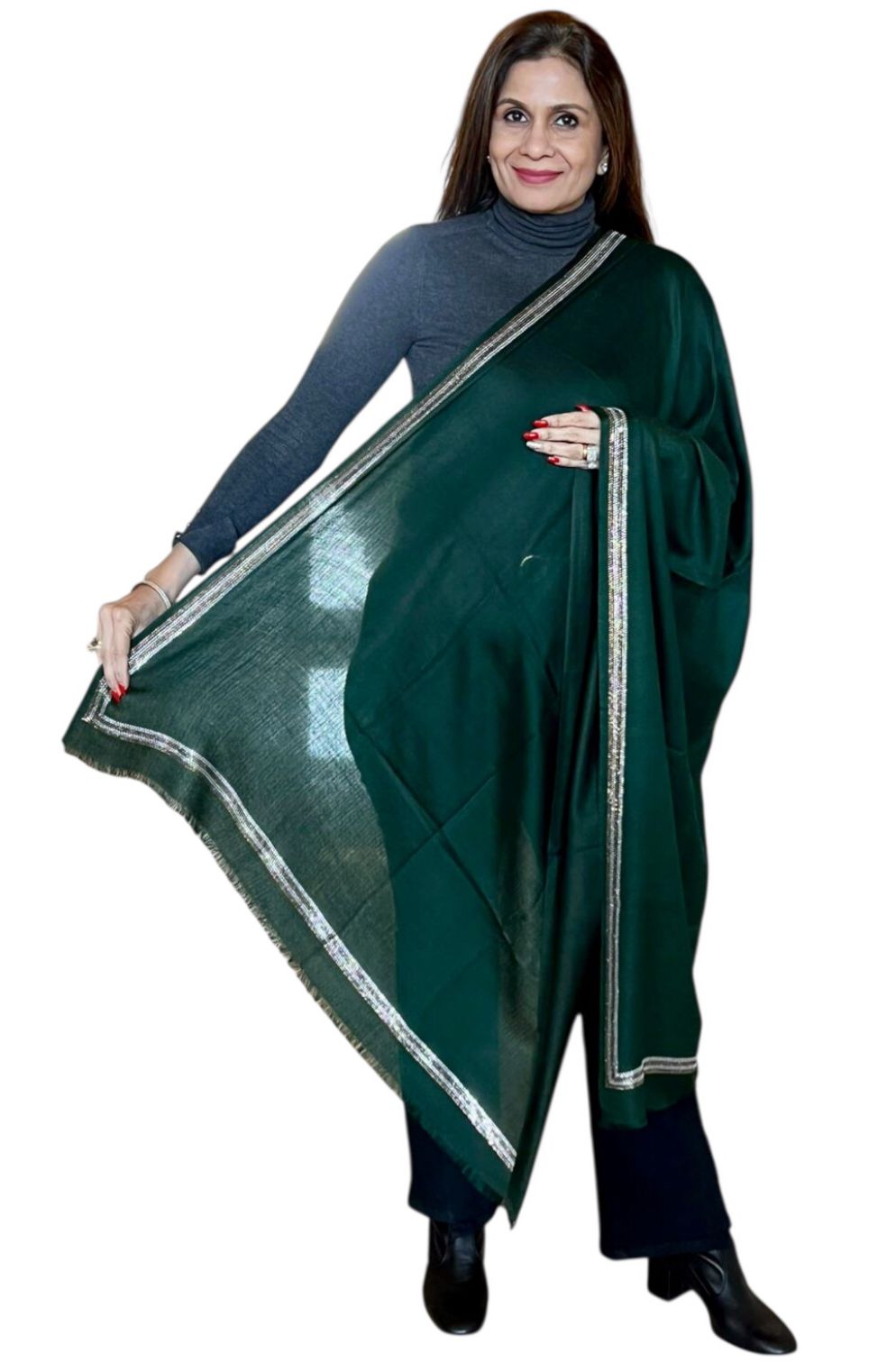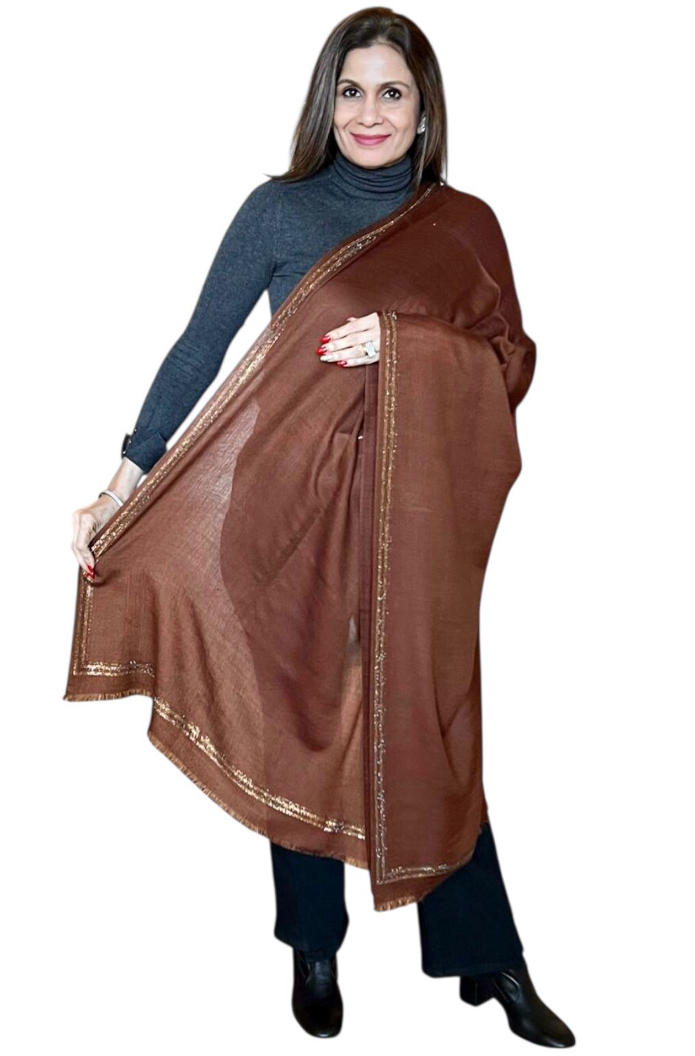 Indulge in timeless luxury with the Regal Shimmer Stole, crafted from premium pashmina for exceptional softness and warmth. Designed in rich, elegant hues, this stole is accentuated with a finely embellished crystal border that adds a subtle yet sophisticated sparkle.