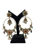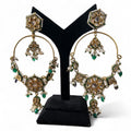 Elevate your festive look with these exquisite handcrafted hoop earrings, adorned with intricate Kundan work, delicate pearls, and green beads. The statement design blends traditional artistry with timeless elegance, making them perfect for weddings, festive occasions, or pairing with ethnic wear.