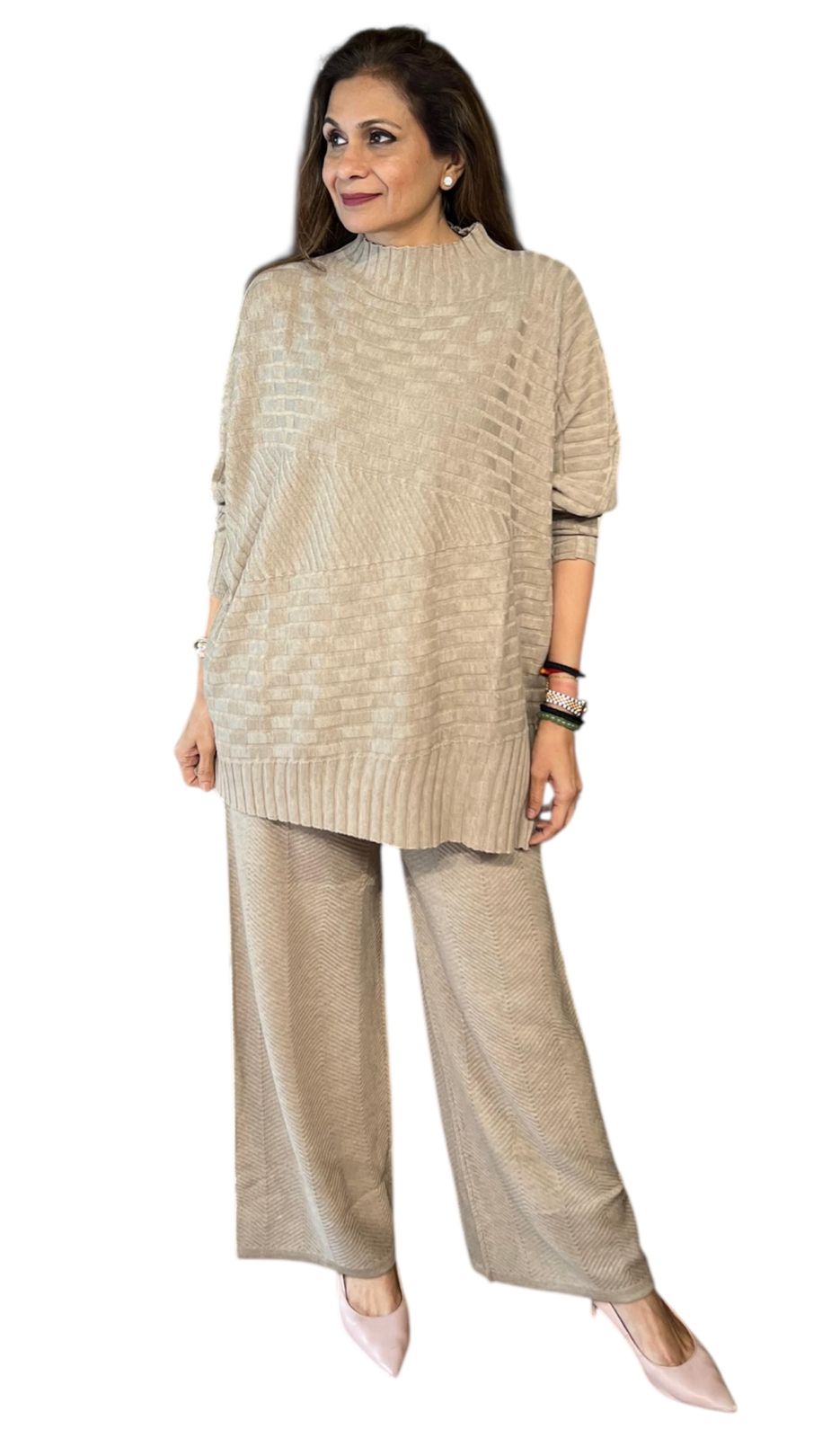 Effortless comfort meets timeless style in our Sand Co-Ord Set. Designed in a soft, textured knit, this free-size co-ord features a high-neck full-sleeve top paired with relaxed wide-leg pants for a cozy yet polished look.