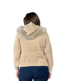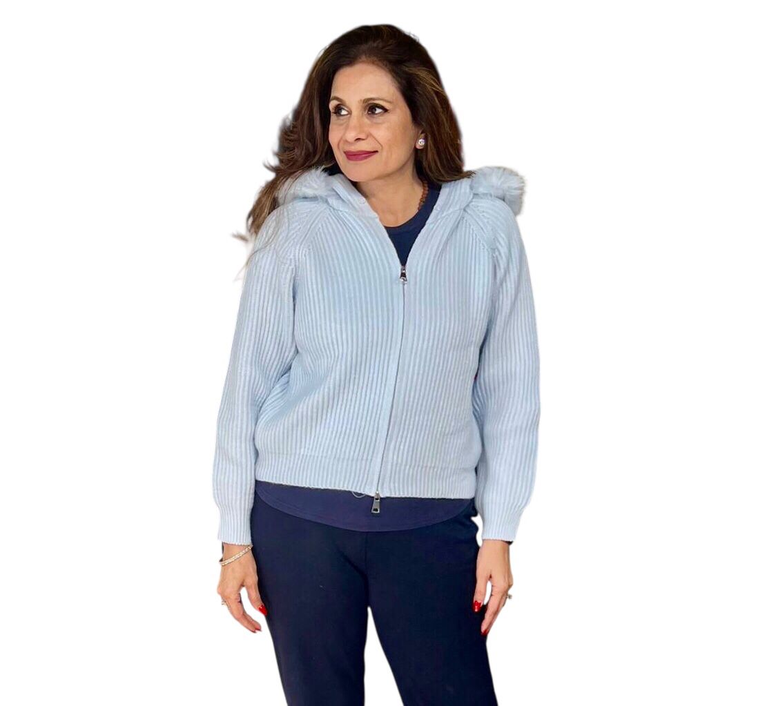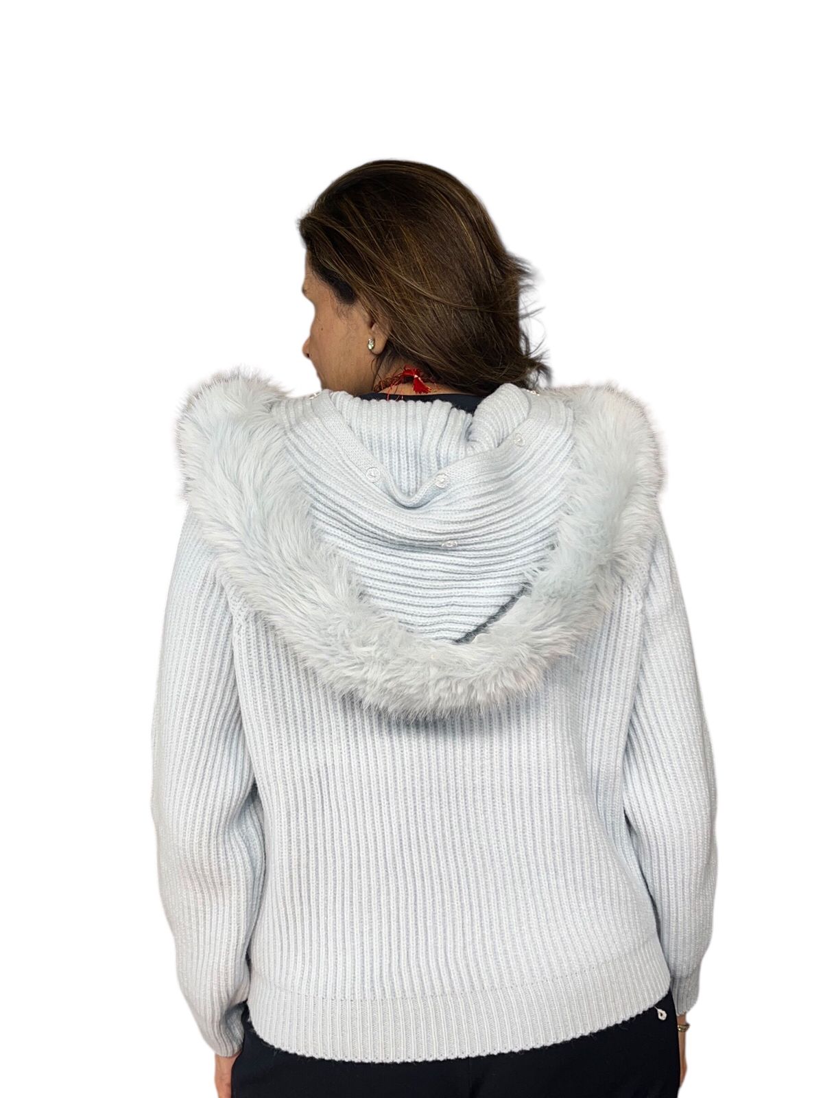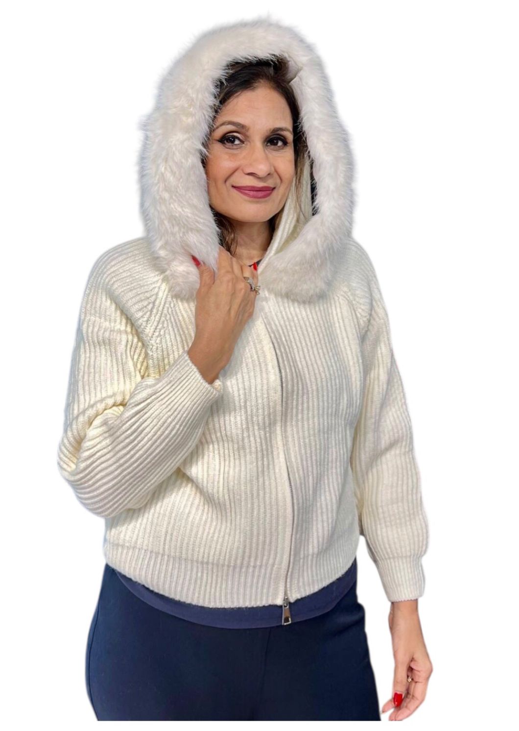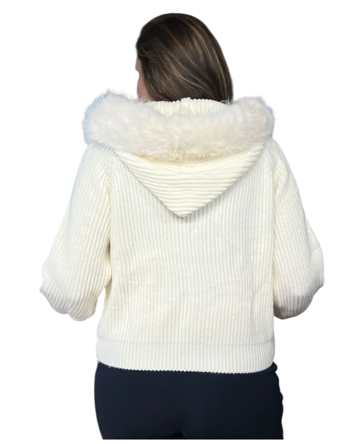 Stay effortlessly cozy with this elegant knit jacket that blends warmth, comfort, and timeless style. Crafted from a soft ribbed knit fabric, this winter essential is elevated with a plush faux-fur–lined hood that adds a luxurious cold-weather charm.