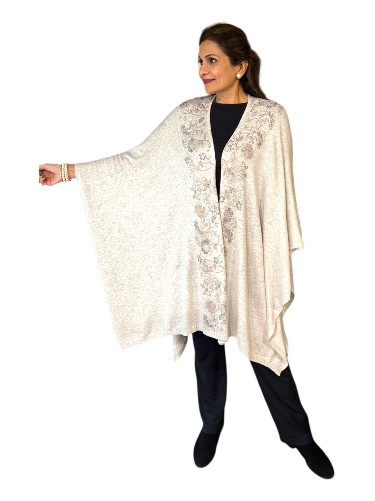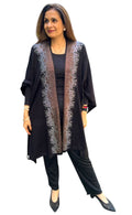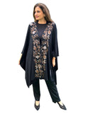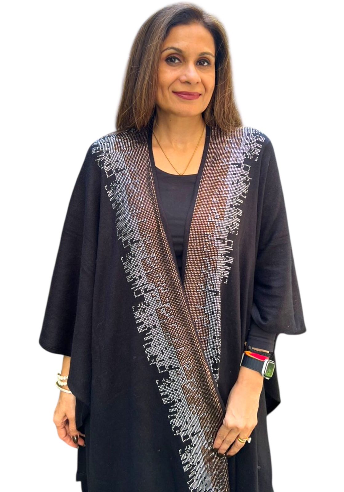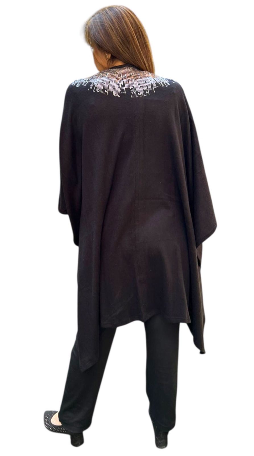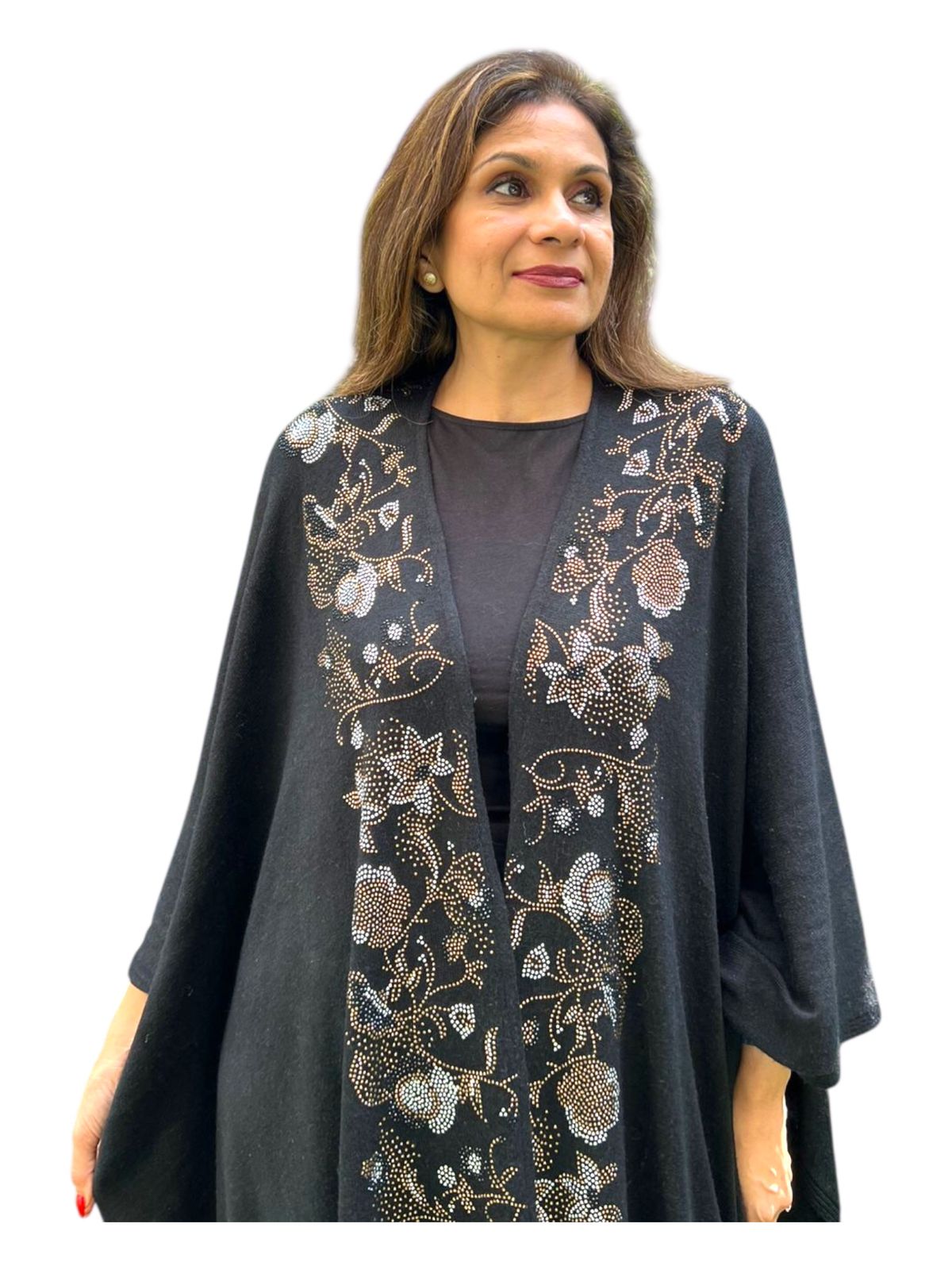 Illuminate your look with the Starflower Cape, where timeless black meets the brilliance of intricate floral embellishments. Designed with sparkling gold and silver accents, this cape drapes gracefully, adding a refined touch of glamour to any ensemble.