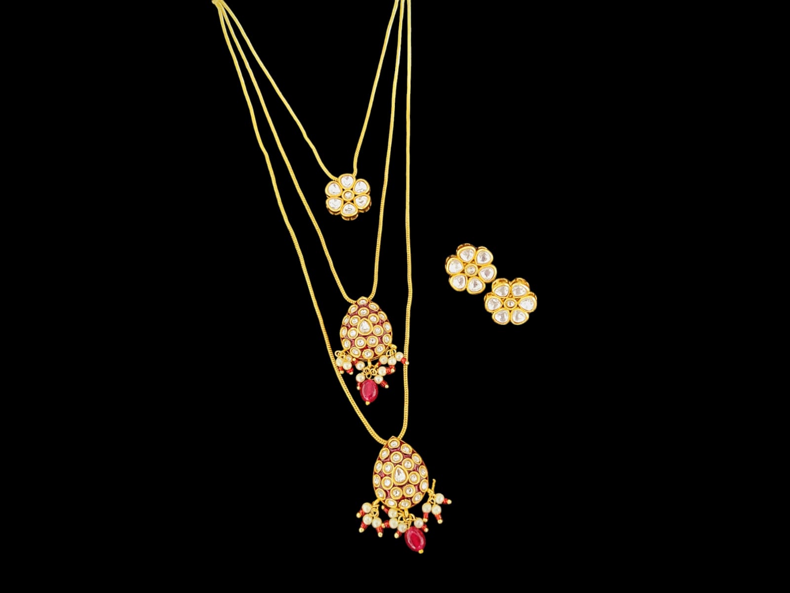 Radiate elegance with this beautifully handcrafted Triple Layer Kundan Necklace Set in a rich gold finish. The necklace features three delicate layers of golden chains, each centered with intricate tear-drop shaped kundan pendants.