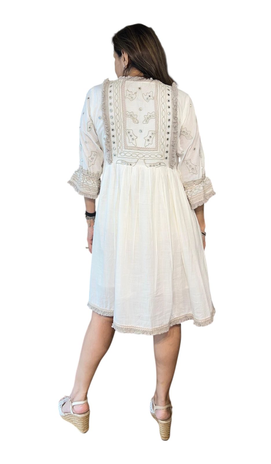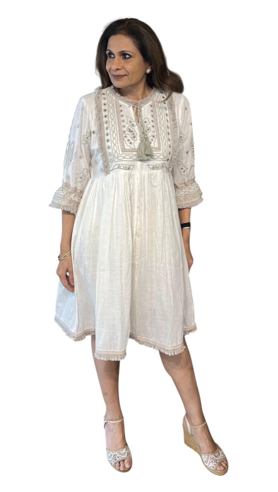 Designed with a tasseled tie-up neckline and folk-inspired embroidery on the yoke, it effortlessly blends bohemian soul with everyday sophistication. Whether you’re dressing up for a brunch, an evening stroll, or a festive celebration, the Twilight Aura Dress adds just the right touch of dreamy detail.