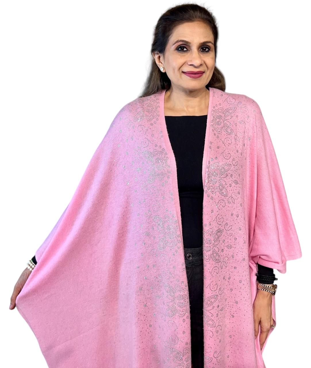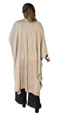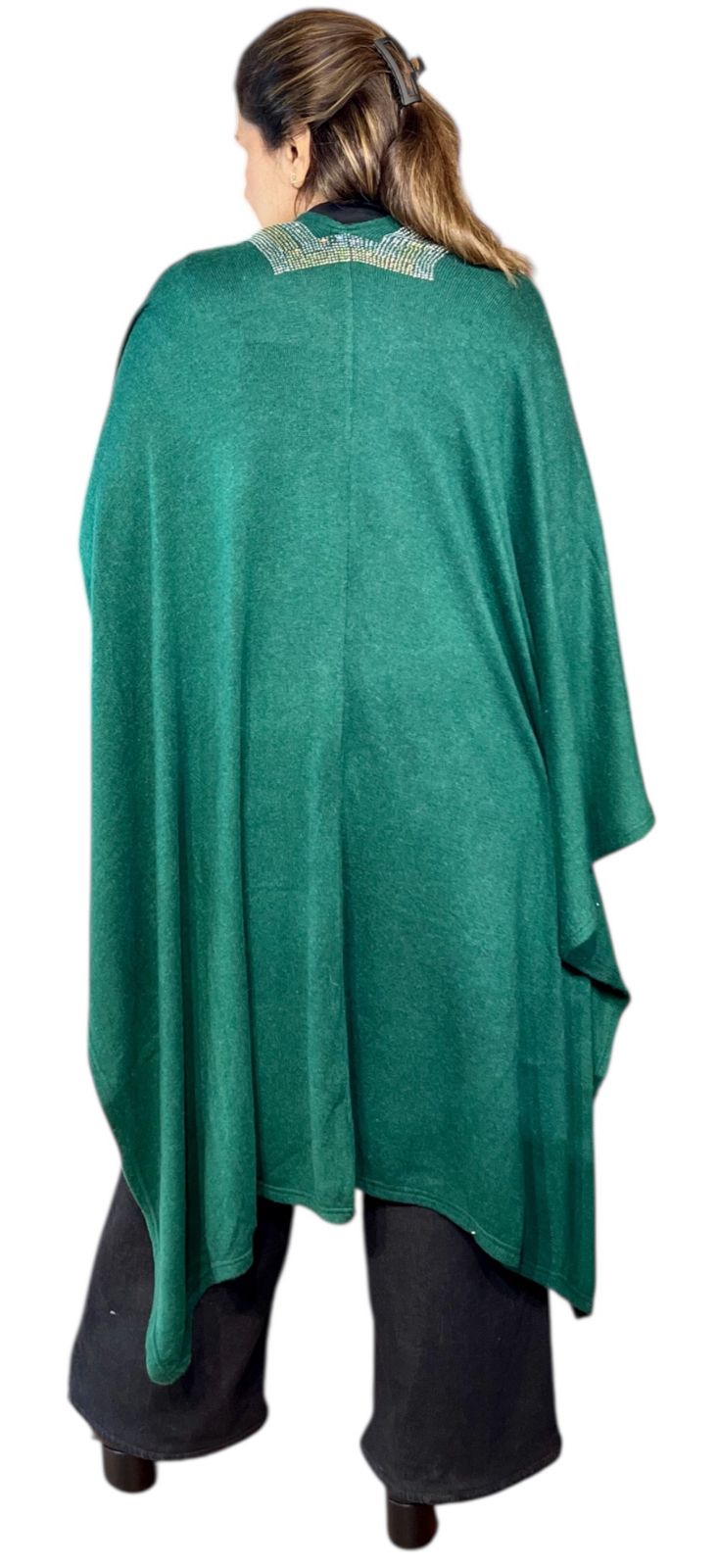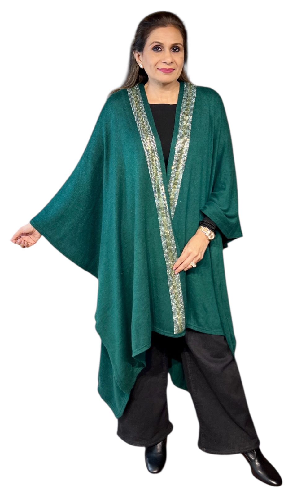 Wrap yourself in understated elegance with the Whisperfall Cape. Designed in a luxuriously soft knit, this long, flowy cape drapes effortlessly, creating a graceful silhouette for all body types. The open-front design is accented with delicate embellishment detailing along the border, adding a subtle shimmer without overpowering the look.